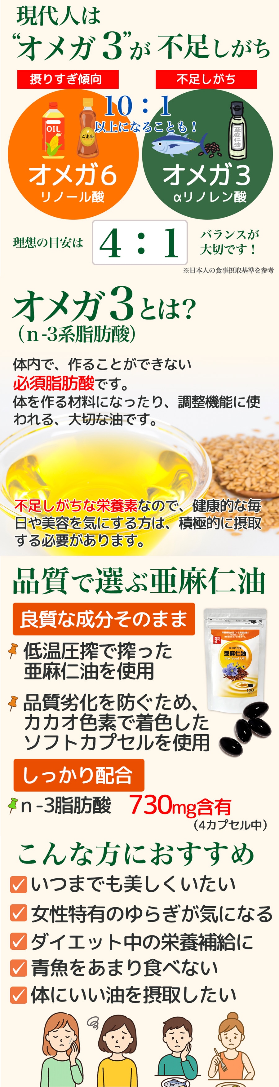 4カプセルで730mgの亜麻仁油を補給できます。
