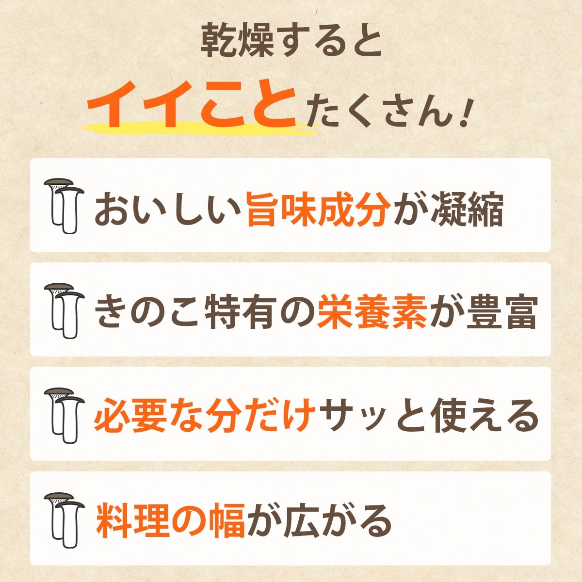 国産・無添加の「信州長野県産 乾燥きのこミックス」は、エリンギをはじめとした厳選された乾燥キノコと乾燥野菜を贅沢に使用した、味噌汁や味噌料理の具材に最適な保存食です。ぶどう糖不使用・ぶどう糖無添加で、素材本来の旨味と栄養をそのまま閉じ込めました。長期保存が可能なため、非常食や防災用の備蓄、ローリングストック、常備菜としても大活躍。お湯で戻すだけの時短調理で、忙しい日々にも手軽に本格的な味わいを楽しめます。信州産のきのこは香り高く、味噌との相性も抜群。化学調味料や添加物を一切使用せず、安心・安全にこだわりました。保存料不使用でありながら長期保存が可能なので、家庭の食品ストックやアウトドア、災害時の備えにも最適です。信州の自然が育んだ乾燥きのこミックスで、毎日の食卓に彩りと健康をお届けします。