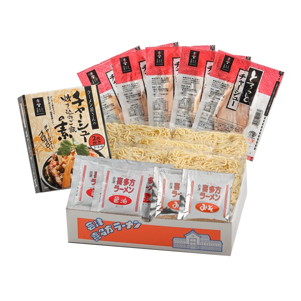 喜多方定番のモチモチ熟成麺のあっさりコク旨醤油ラーメンにやわらかい自家製チャーシューのうれしい具材付き。切り落としチャーシューをふんだんに使ったチャーシュー炊き込みご飯の素をセットしました。