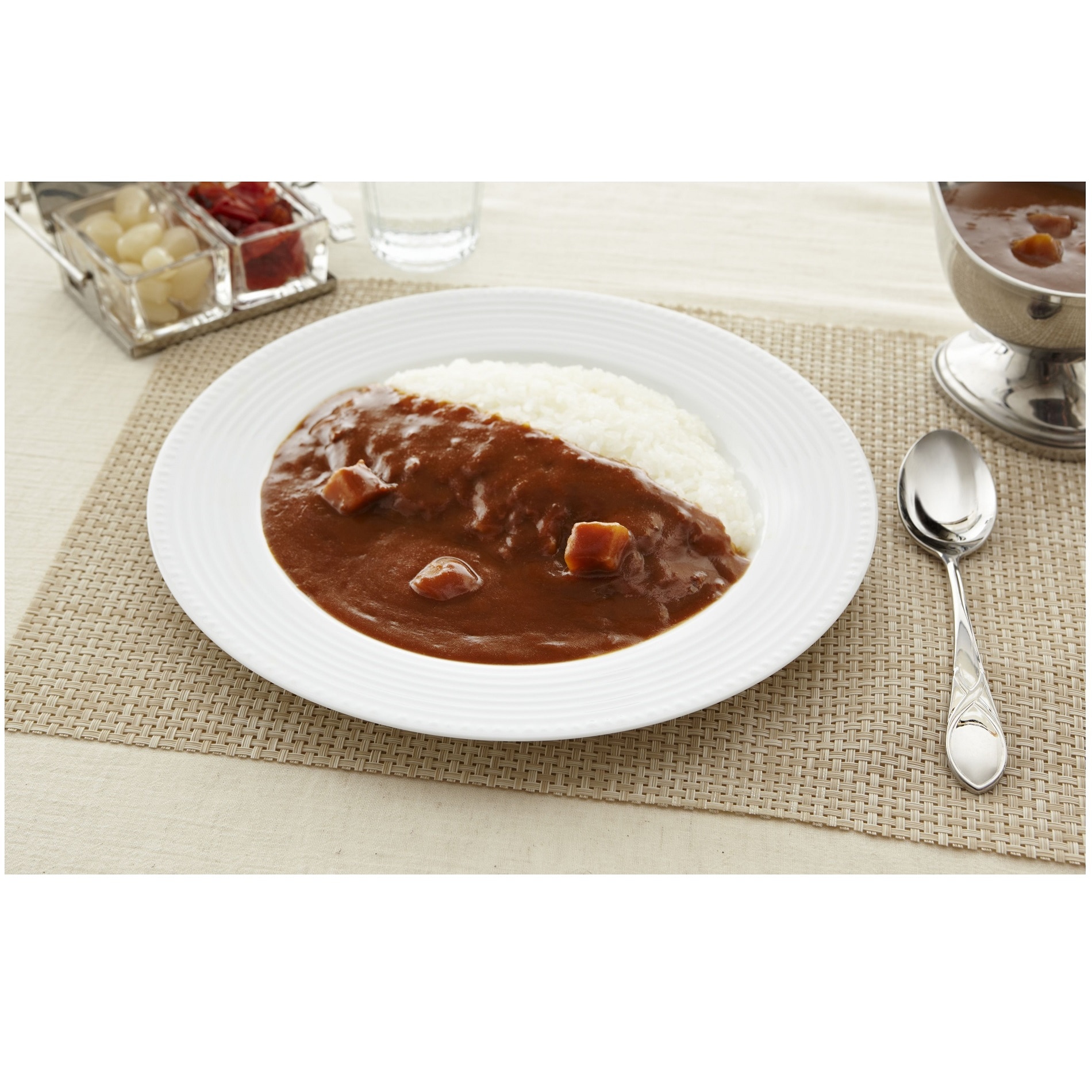 ・原材料/材質/素材:小麦粉(国内製造)、牛脂肪、じゃがいも、牛スープ、チャツネ、砂糖、植物油、ソテーオニオン、トマトペースト、食塩、ショートニング、カレー粉、濃縮りんご果汁、乳等を主要原料とする食品、しょう油、ヨーグルト、牛肉、ウスターソース、クミン末、ウコン末、ナチュラルチーズ、オニオン末、しょうが、にんにく、酵母エキス、カルダモン末、コリアンダー末、黒こしょう末、ビーフエキス調味料、準チョコレート、卵黄、赤唐辛子末/調味料(アミノ酸等)、カラメル色素、酸味料、香料、(一部に卵・乳成分・小麦・牛肉・大豆・豚肉・りんごを含む)