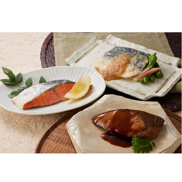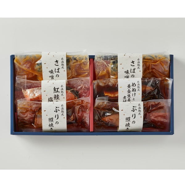 - めぬけと黄金生姜の煮付け100g×1、さばの味噌煮90g×2、紅鮭の塩焼き60g×1、ぶりの照焼き90g×2