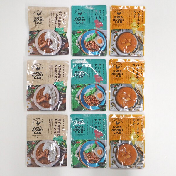 - AWAODORI LABごちそうチキンカレー190g×3、AWAODORI LAB阿波尾鶏ガパオライスの素130g×3、AWAODORI LABバターチキンカレー180g×3