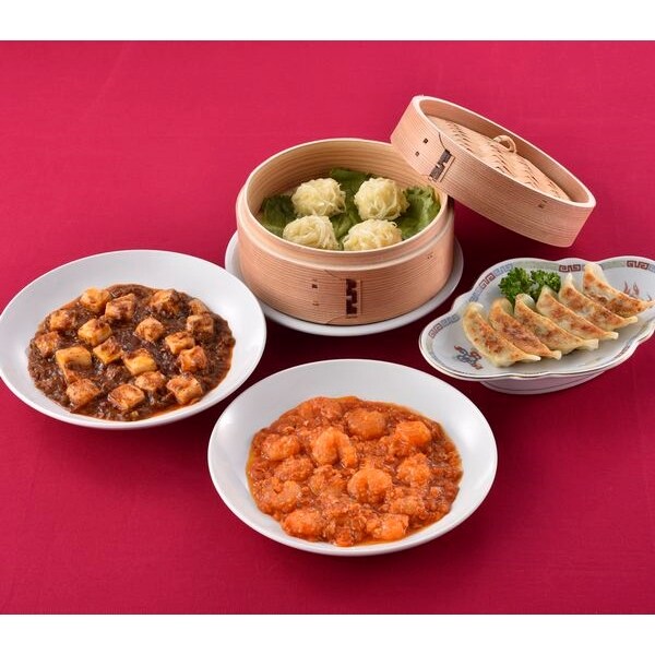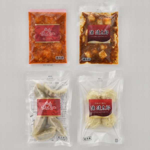 - 陳建一監修(餃子120g(6個入)×1,乾焼蝦仁(エビチリソース)150g×1),陳建太郎監修(陳麻婆豆腐5年熟成使用150g×1,豆腐焼売4個入×1)