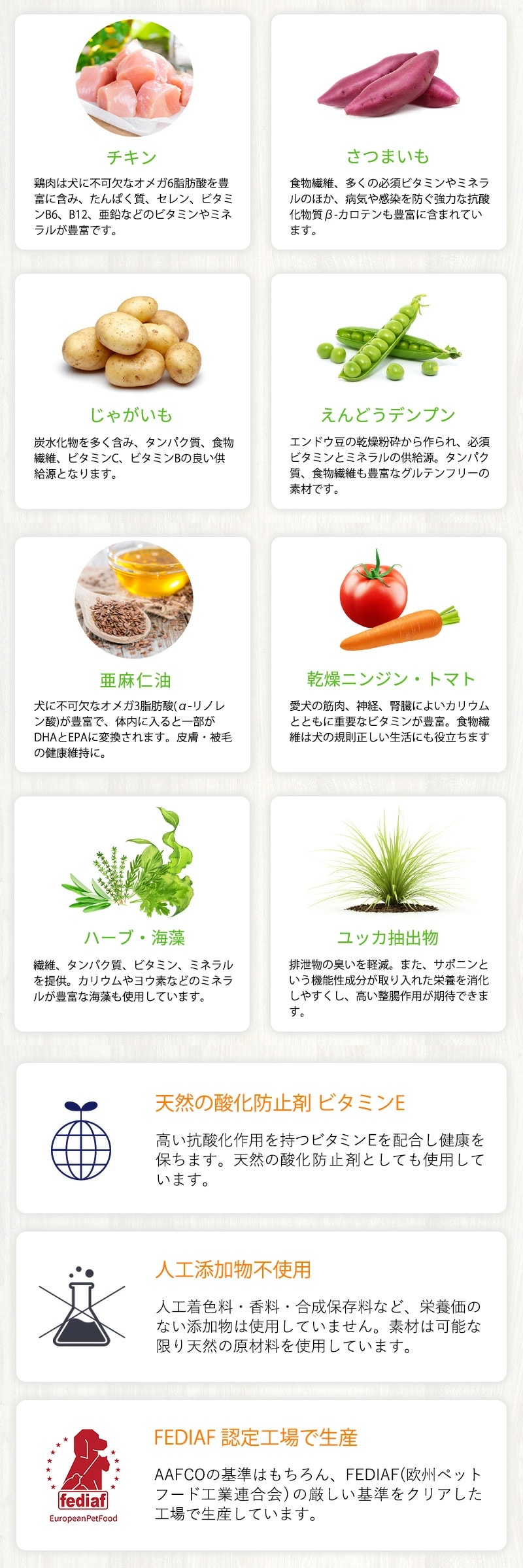 第一主原料のチキン49.5%のうち新鮮な鶏肉(フレッシュチキン)を17%使用。麦類、米、トウモロコシなどの穀物を使わない食物アレルギーに配慮したグレインフリーのドッグフードです。無香料、無着色、合成保存料不使用で、成犬の健康維持に必要な栄養をバランスよく配合し、健やかな毎日をサポートする総合栄養食です。