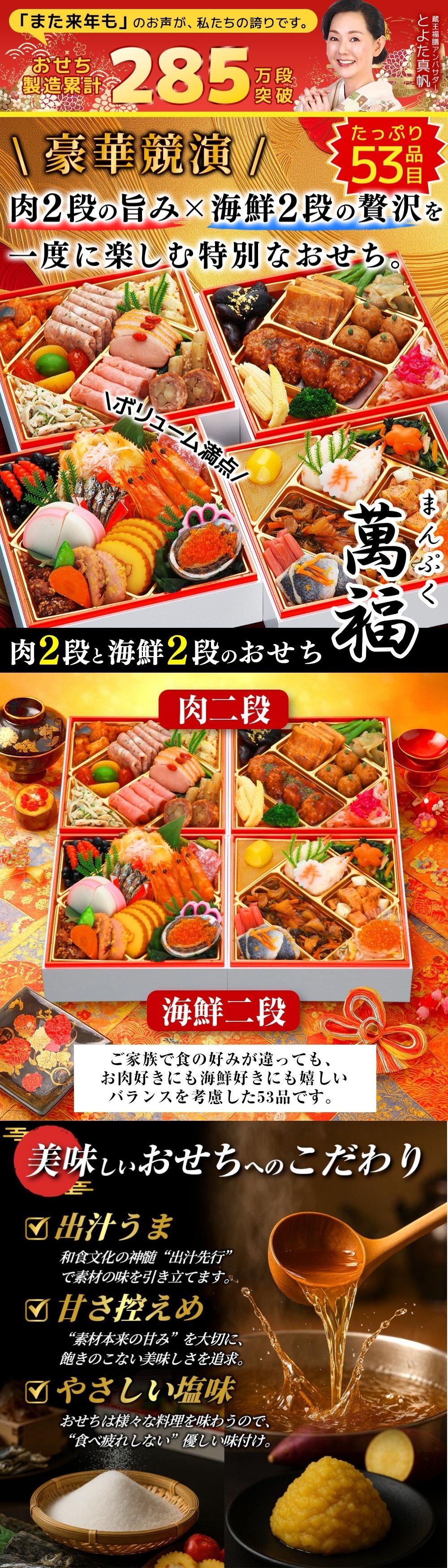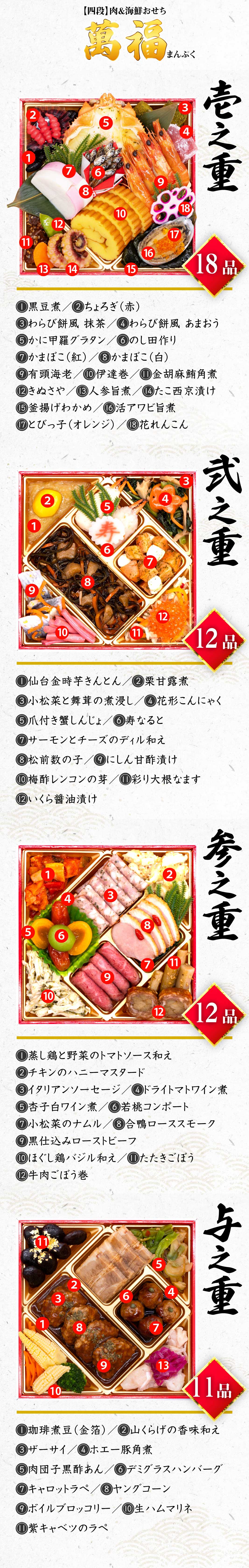 【12/30午前着】おせち「萬福」(6寸/53品/3-4人前/肉&海鮮/四段重) | お肉と海鮮の美味しさを一度に味わう贅沢おせち