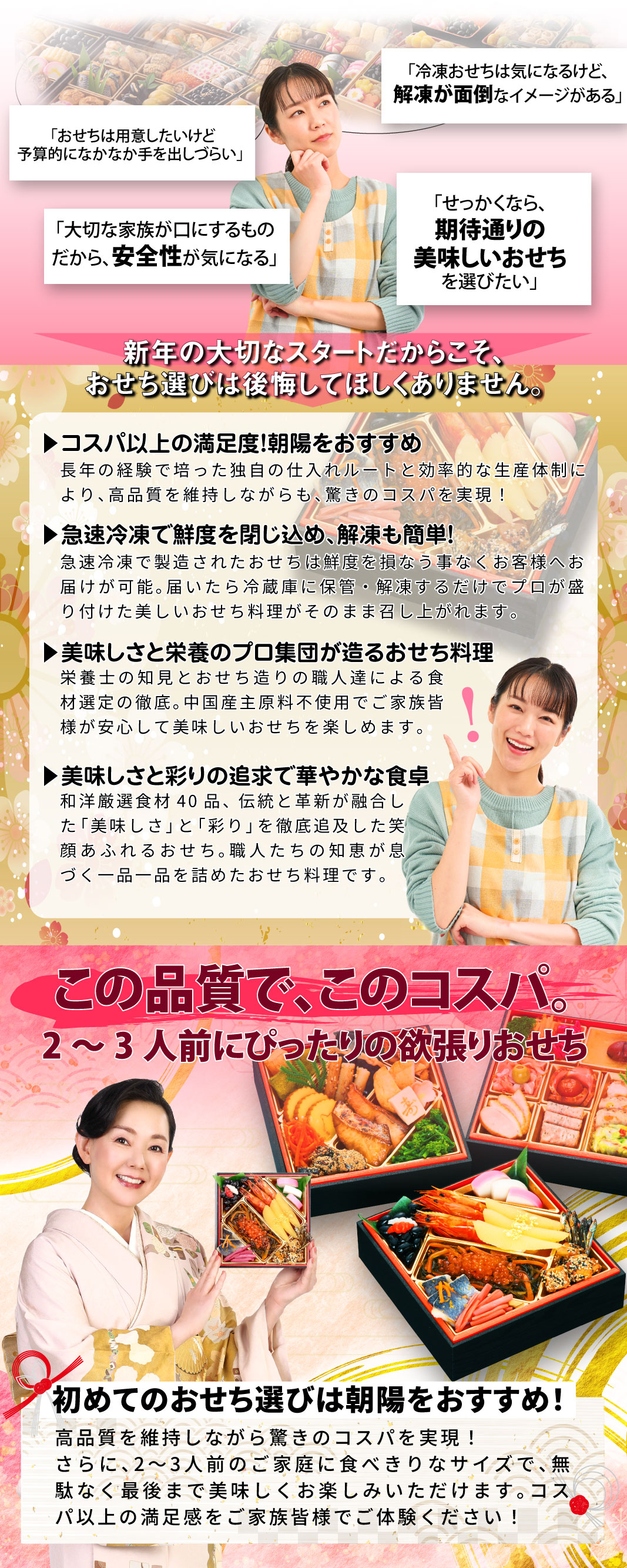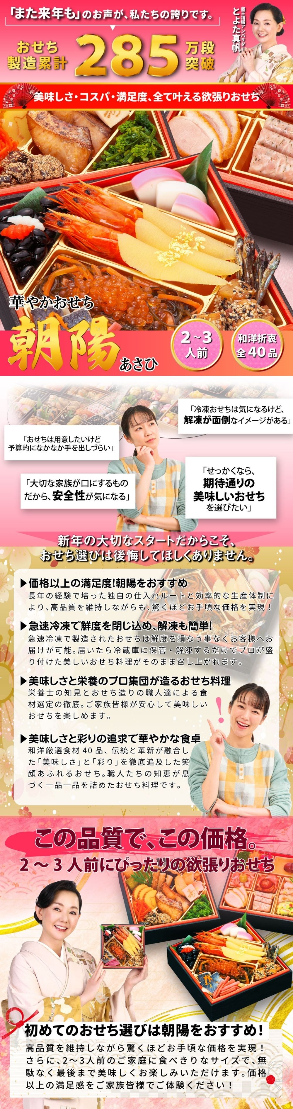 【12/29着】おせち「朝陽」(6寸/40品/2-3人前/和洋/三段重) | 冷凍おせちに迷ったらまずはこれ!初めての方にもおすすめのコスパ抜群華やか和洋おせち