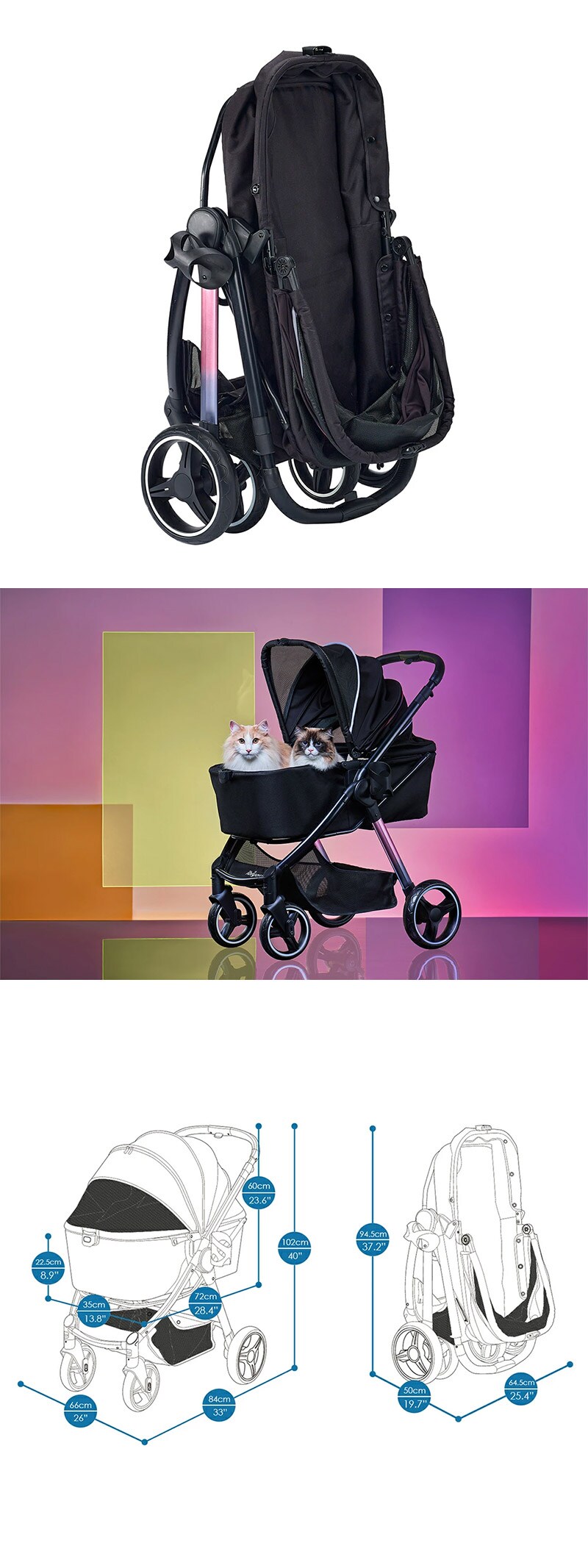 ファスナーレスマグネットデザインを採用し、両開きのエレガントなキャビンと軽量アルミ合金フレームを採用。絶妙でなめらかなグラデーションデザインを施した、高級感あふれるペットカートです。