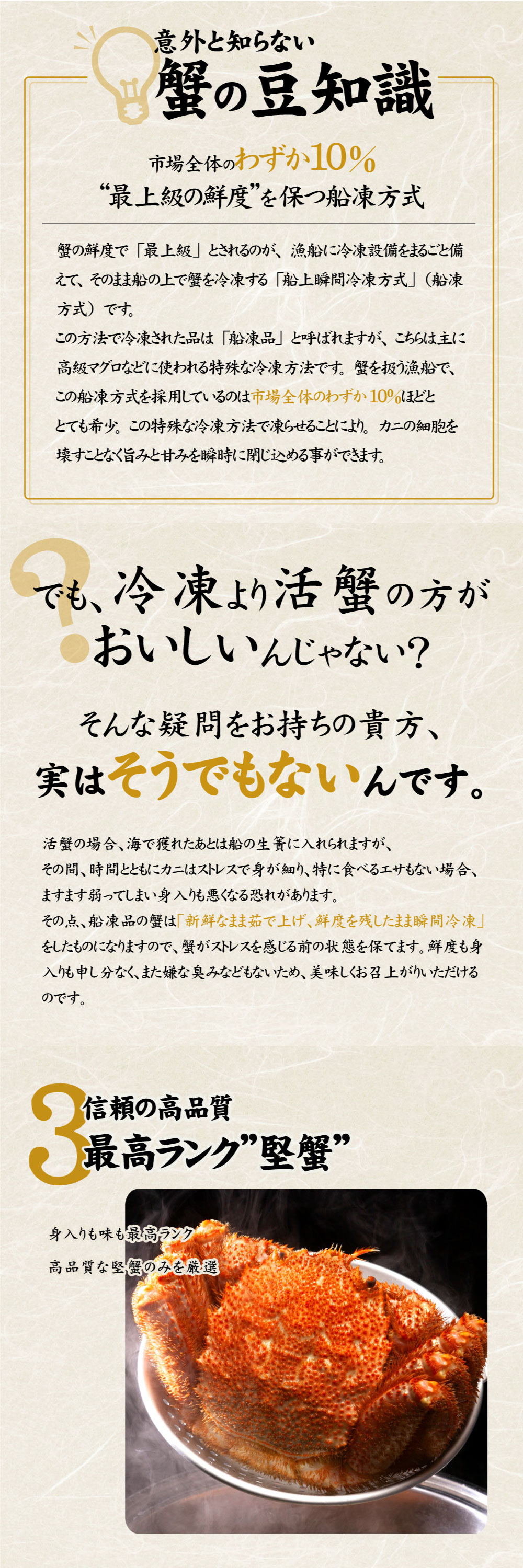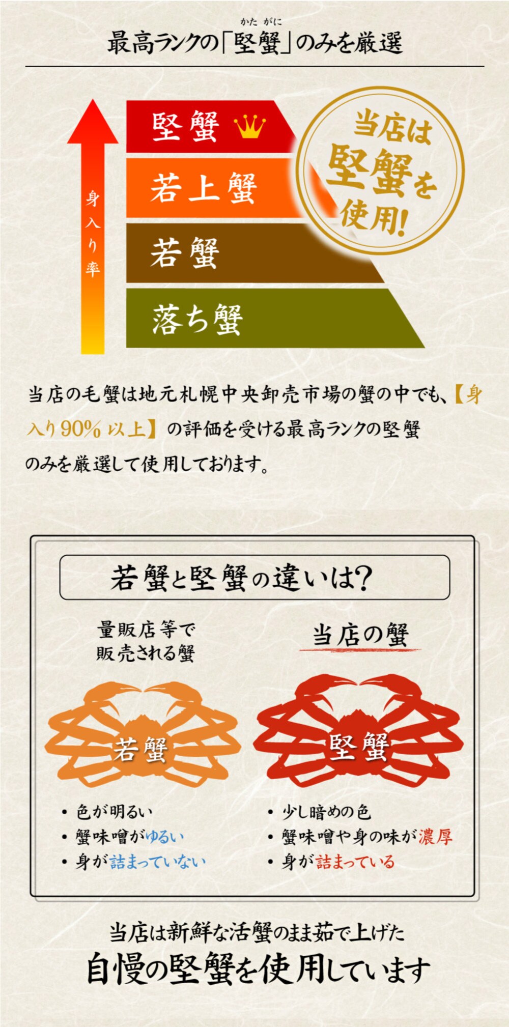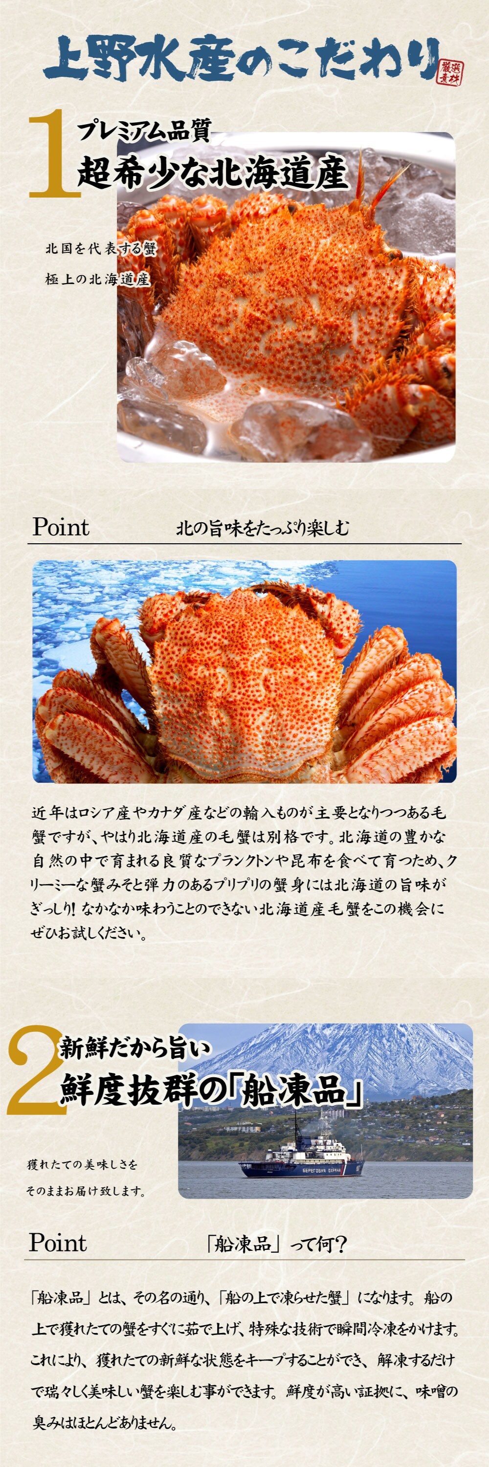 北海道産毛蟹570g | 身入りも味も札幌中央卸売市場の毛蟹の中でも高品質な堅蟹のみを厳選。