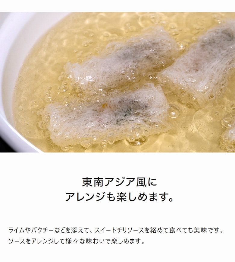 ・原材料/材質/素材:野菜(葛芋、とうもろこし、人参、玉ねぎ、にら、にんにく)、えび、きくらげ、春雨、コーンスターチ、豚脂、砂糖、酵母エキス、魚醤、食塩、こしょう、皮(米粉、植物油脂、タピオカでん粉、食塩)/重曹、クエン酸Na、(一部にえび・豚肉を含む)