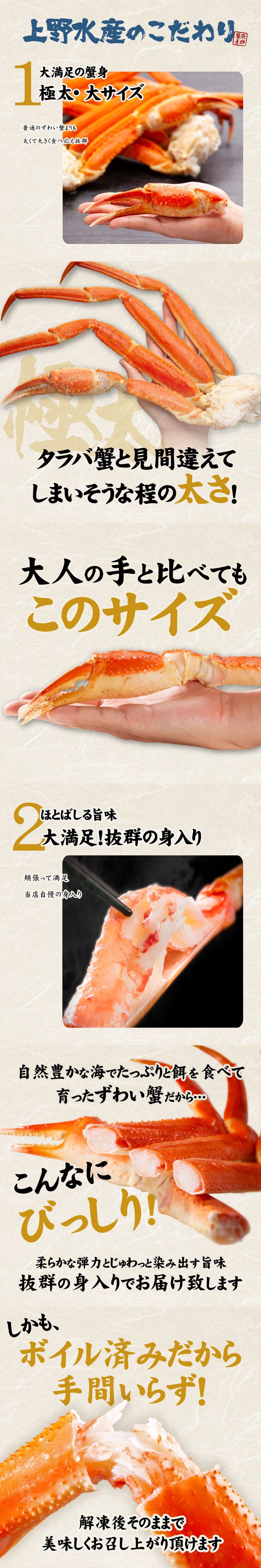 ※ズワイガニの性質上小指(一番下の小さい足)や足先の一部が欠けている場合がございます。ご了承くださいませ。