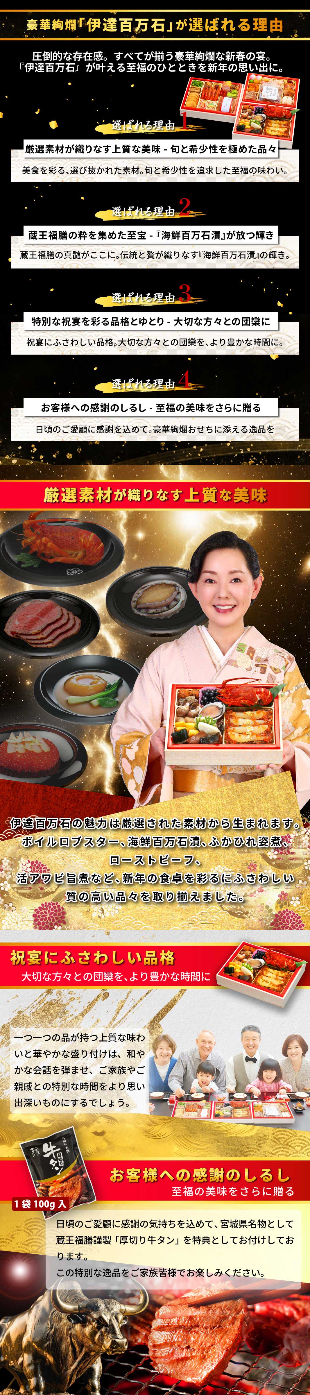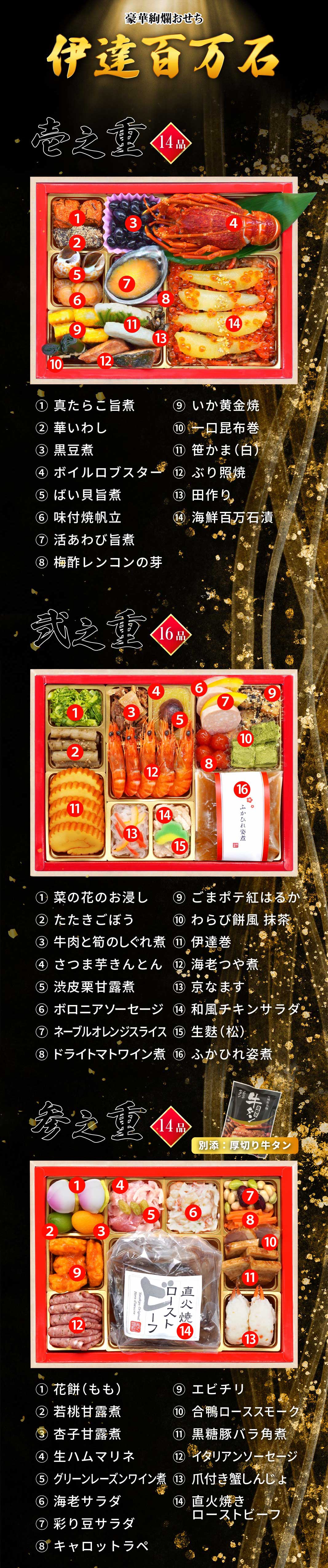 【12/29着】おせち「伊達百万石」(45品/約4-5人前/和洋中三段重) | 高級素材を詰め込んだ宝石箱のような豪華絢爛本格贅沢おせち