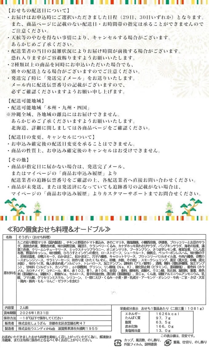 - 【12/29着】京都しょうざん おせち「和の個食おせち料理&オードブル」(2人前/46種46品)