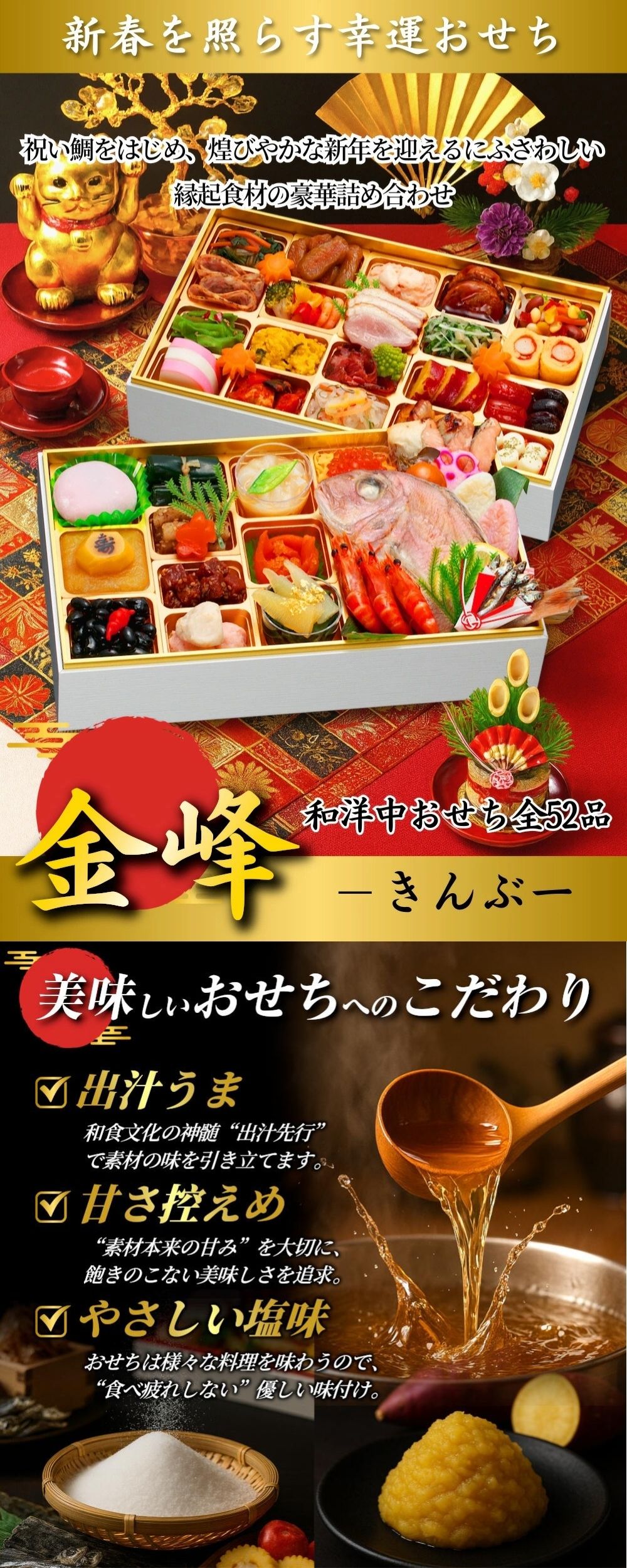【12/30午前着】おせち「金峰」(10.5寸長方/52品/3-4人前) | 鯛、数の子など華やか食材たっぷり52品。新春を照らす幸運おせち