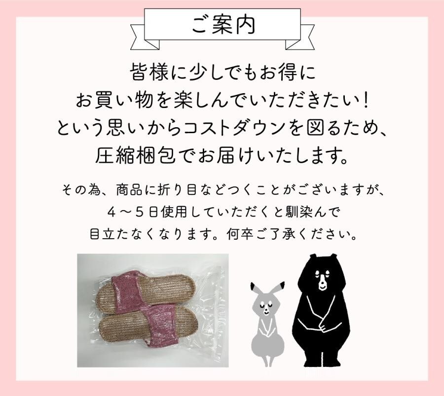 ●環境に配慮しできる限りコンパクトな梱包を心掛けています。その為、多少商品に折り目がつくことがありますが、4、5日使用していただくと馴染んで目立たなくなります。何卒ご了承ください。