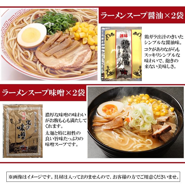 - 麺(180g×4袋)、スープ(醤油:2袋、味噌:2袋)