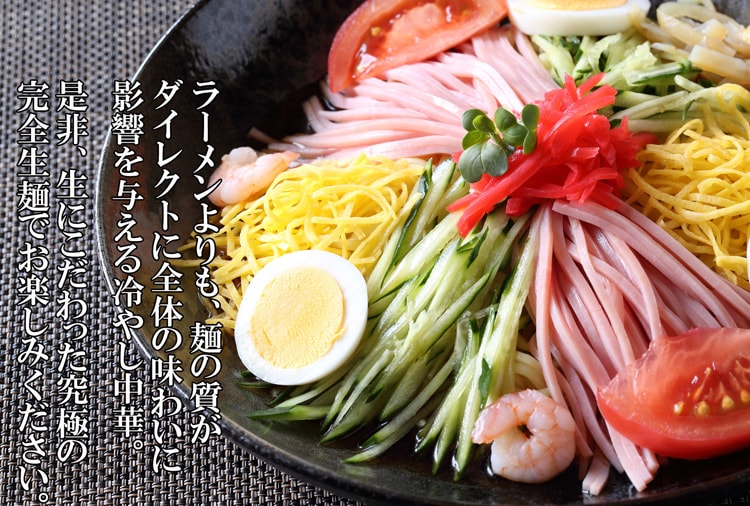冷やし中華は麺の質で味わいが変わります!!プロの中華屋でも使われている生麺を製麺所からご自宅へ直送します!賞味期限は10日しかありませんが、通常では考えられない高加水率の完全生麺をお届けします!小麦の味わいと極上の食感をお楽しみください!しっかり熟成させてからお届けする麺はご自宅で今まで味わえなかった本物の麺です!プロが扱う業務用の冷やし中華スープ付き!