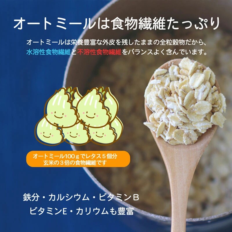 オートミールは栄養豊富な外皮を残したままの全粒穀物だから、水溶性食物繊維と不溶性食物繊維をバランスよく含んでいます。鉄分・カルシウム・ビタミンB・ビタミンE・カリウムも豊富。