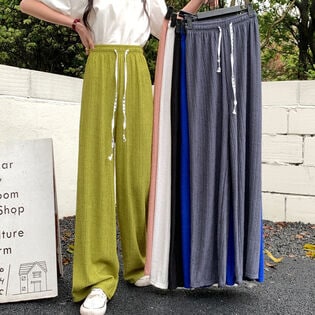 - 【グリーン】ウエストゴムリラックスワイドパンツ