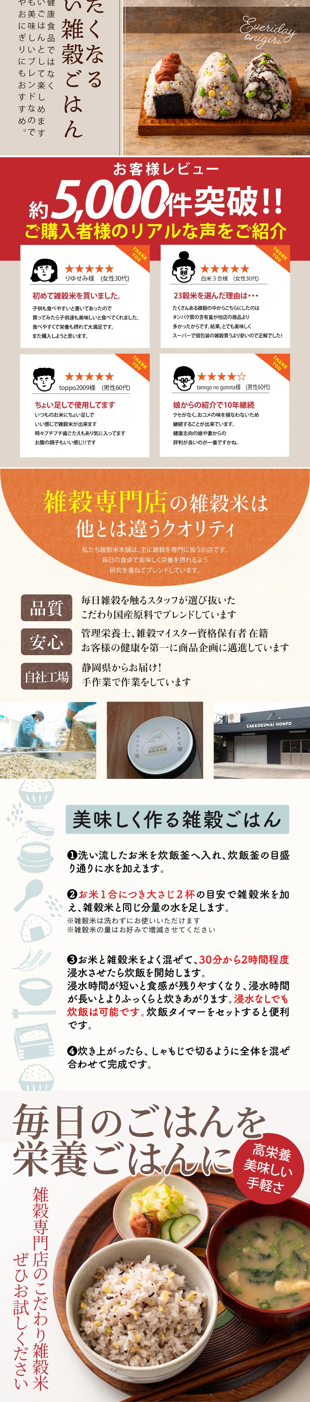 当店の商品は全て国内産の雑穀にこだわり、お子様からご年配の方までみんなが安心して食べられるよう心を込めて製造、出荷しております。当店の雑穀は栄養素だけでなくみんなが「おいしく」食べられることを何より大切にしているのが他との大きな違いです。従業員全員で何度もブレンド、試食を繰り返した一杯に自信を持っています。もちろんおいしさと一緒に雑穀のたっぷりの栄養もぎゅぎゅっと詰め込みました。雑穀に不安を持っている方に雑穀のおいしさを知ってもらい、雑穀本来の旨みを味わってもらいたい、そんな雑穀への一途な愛を込めた一杯をお届けします。いつもの炊き立てごはんに、愛情と栄養たっぷりの雑穀を是非一度ブレンドしてみてください!体の中から健康に、雑穀米の美味しさに思わずみんな笑顔に!そんな毎日を雑穀米本舗がお手伝いさせて頂きます!