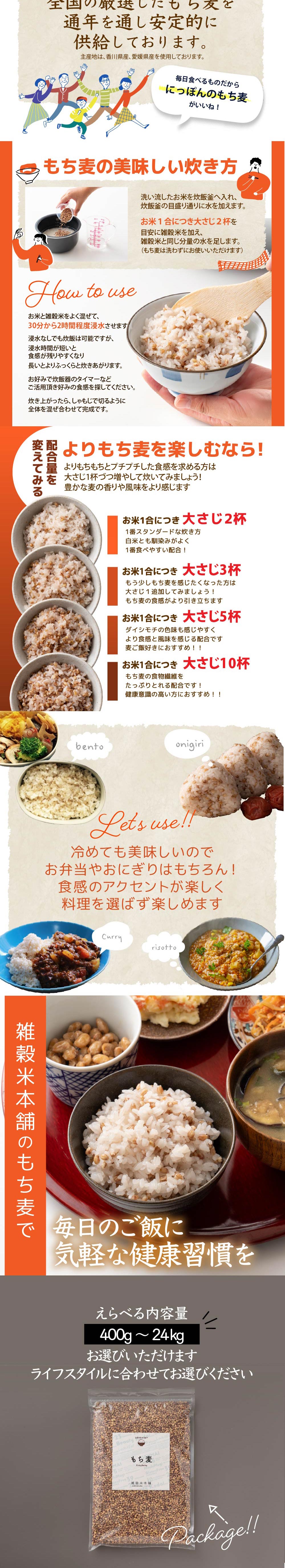 ・その他商品仕様:もち麦のおはぎ もち麦入りオムライス トロトロポタージュ もち麦とブロッコリーのサラダ 雑穀のビビンバ 雑穀入りチャーハン 麦の食べるスープ 麦ご飯のドリア もち麦ご飯の焼きおにぎり 麦ご飯のお茶漬け などにおすすめ!