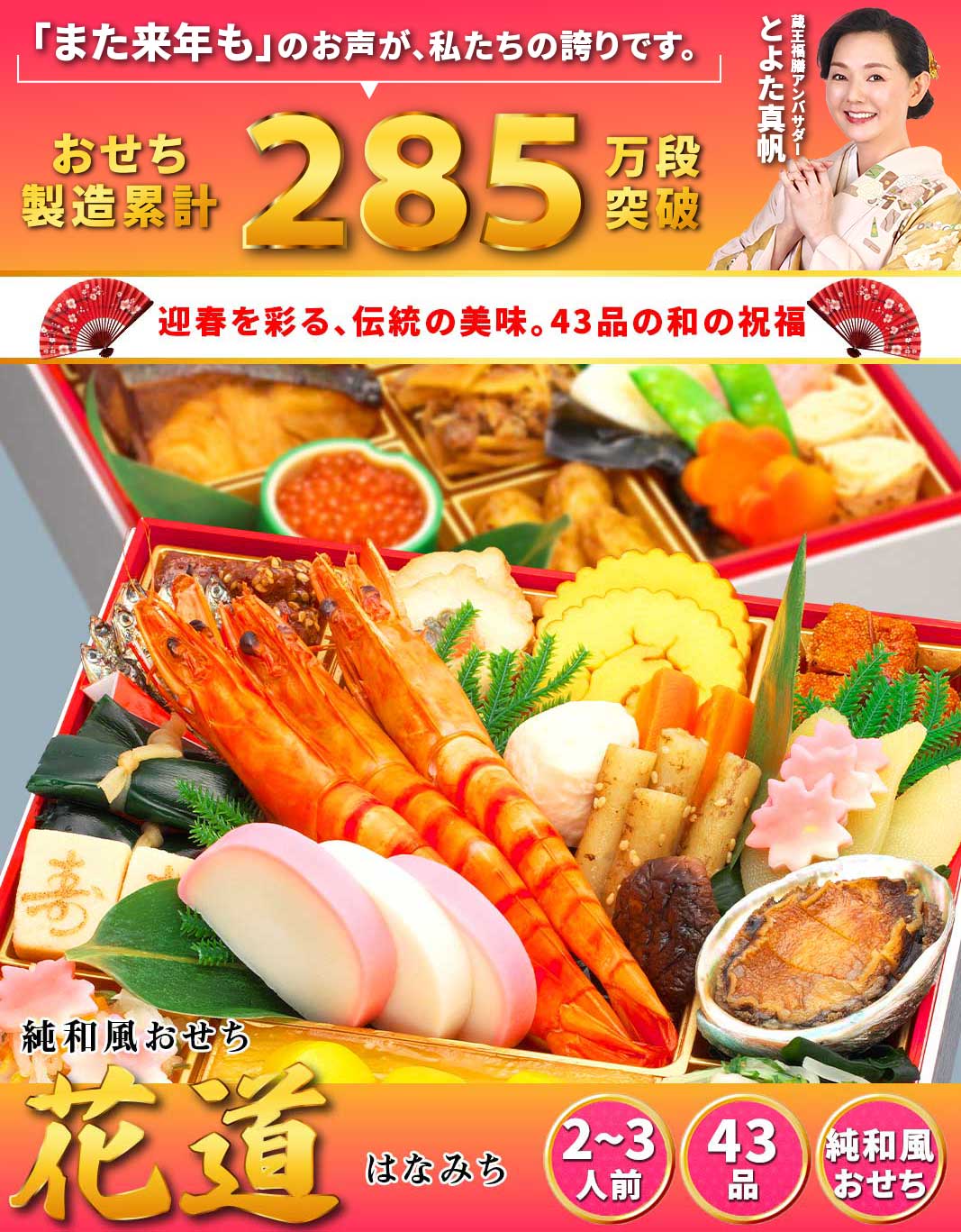 【12/30午前着】おせち「花道」(8寸/43品/2~3人前/純和風おせち二段重) | 厳選された食材を素材の美味しさそのままに、バランスよく盛り付けた本格和風おせち
