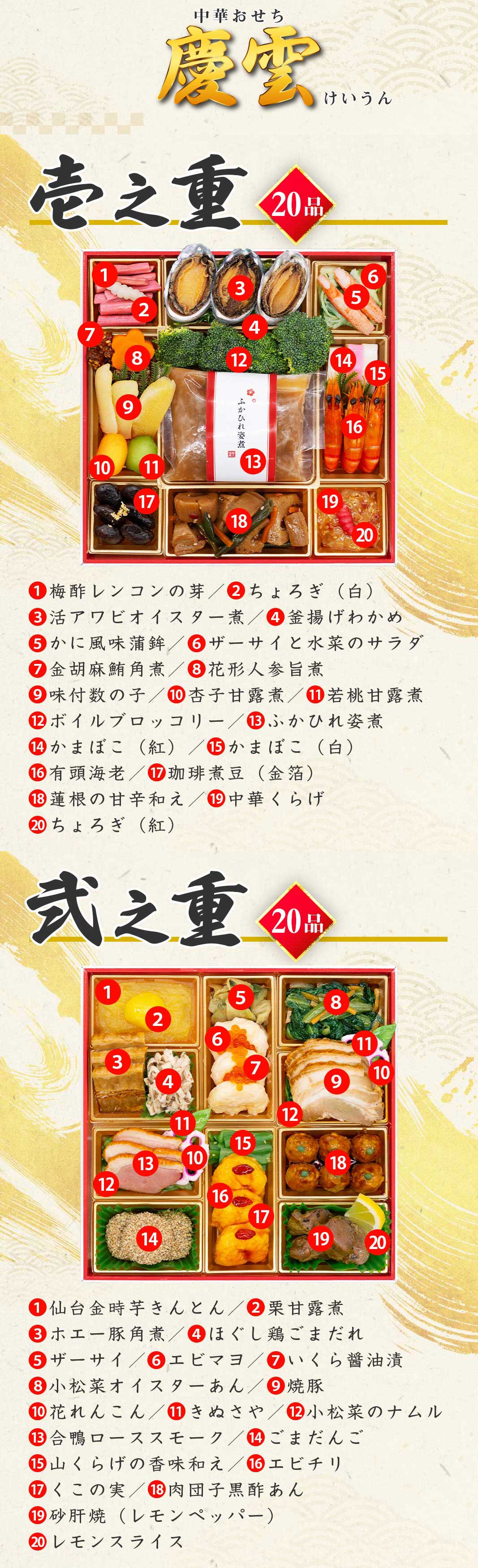 【12/30午前着】おせち「慶雲」(8寸/40品/2~3人前/中華おせち二段重) | ふかひれ姿煮が丸ごと入った本格中華を堪能する中華二段重