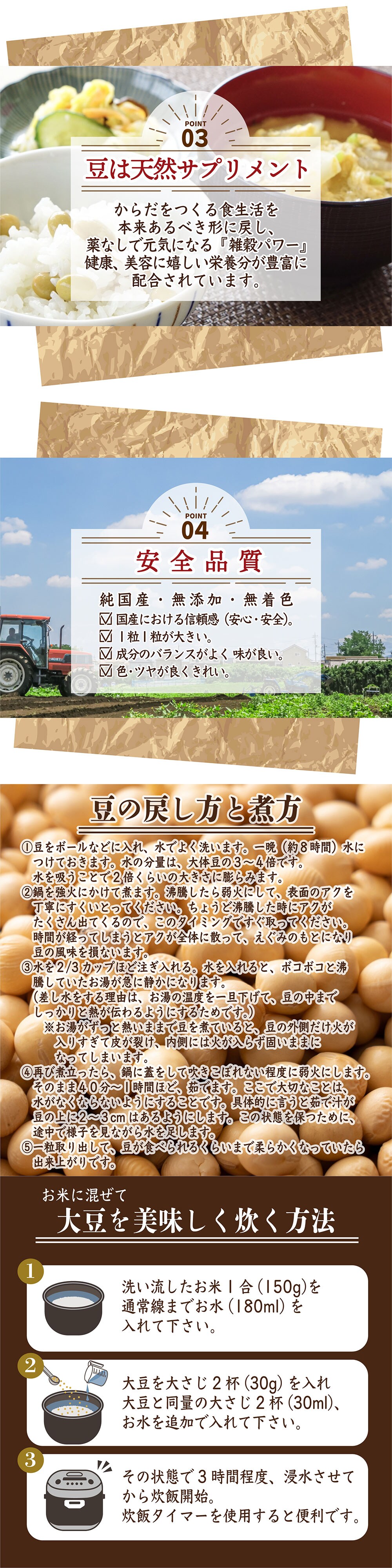 私たち雑穀米本舗が取り扱う、国産 黄大豆を是非ご賞味いただき、イソフラボンの効果でお肌をみずみずしく、若々しく保ちましょう。
