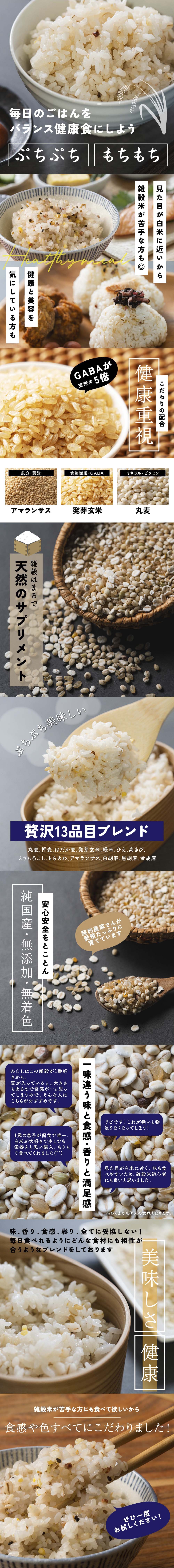 ・原材料/材質/素材:丸麦(国産)、押麦、はだか麦、発芽玄米、緑米、ひえ、高きび、とうもろこし、もちあわ、アマランサス、白胡麻、黒胡麻、金胡麻(一部にごまを含む)