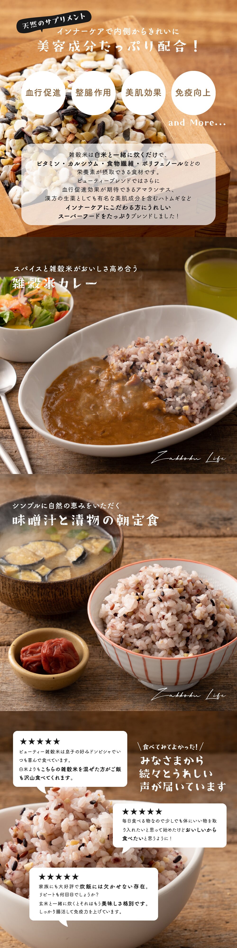 ビューティーブレンドは、とことん美容を意識して作りました。食物繊維とビタミンのバランスに優れた麦類、無駄のない栄養豊富な豆類、ミネラル豊富な雑穀類、そして味わい深く、栄養も優れた米類を厳選しました。