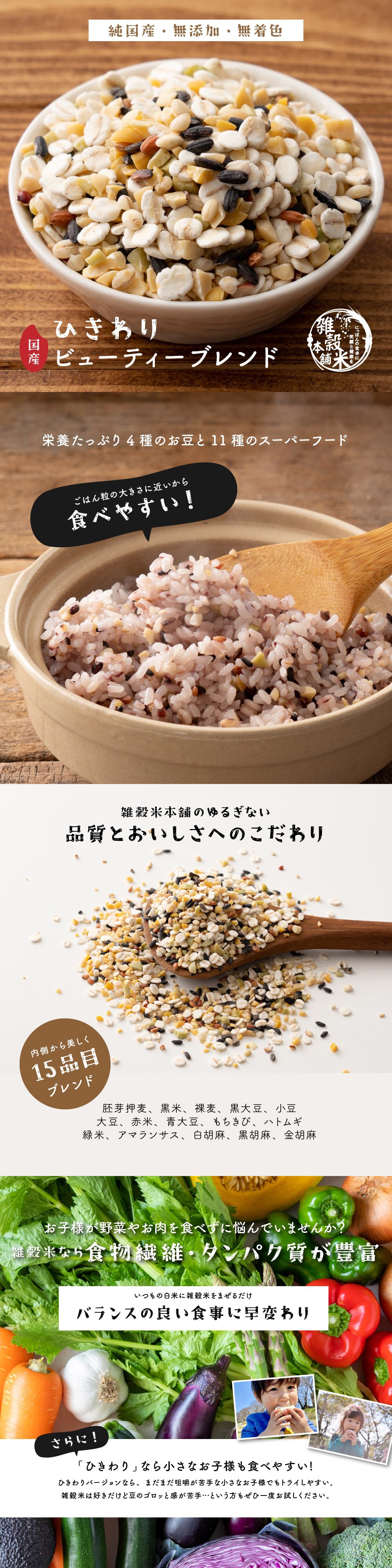 ビューティーブレンドは、とことん美容を意識して作りました。食物繊維とビタミンのバランスに優れた麦類、無駄のない栄養豊富な豆類、ミネラル豊富な雑穀類、そして味わい深く、栄養も優れた米類を厳選しました。