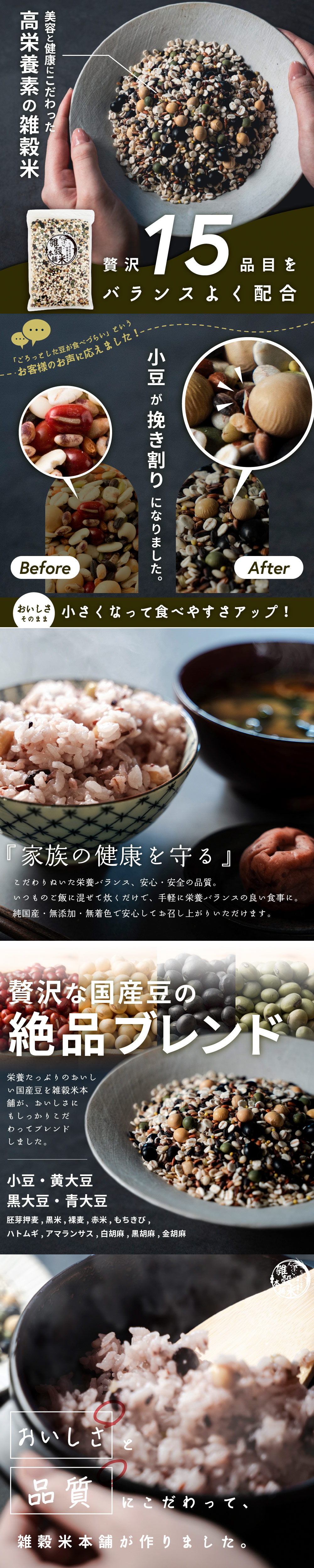健康な美しさを極めたいという、美容に対する目的意識から誕生しました。厳選した国産雑穀米だけをブレンド。鉄分・ビタミン群・ポリフェノール、たっぷりのミネラル成分を含んでいます。贅沢にお豆を配合しました。ごちそう感もたっぷりで、食事も楽しくなります。食物繊維もたくさん摂れて、食べ応えたっぷり。噛むほどに旨味が広がります。