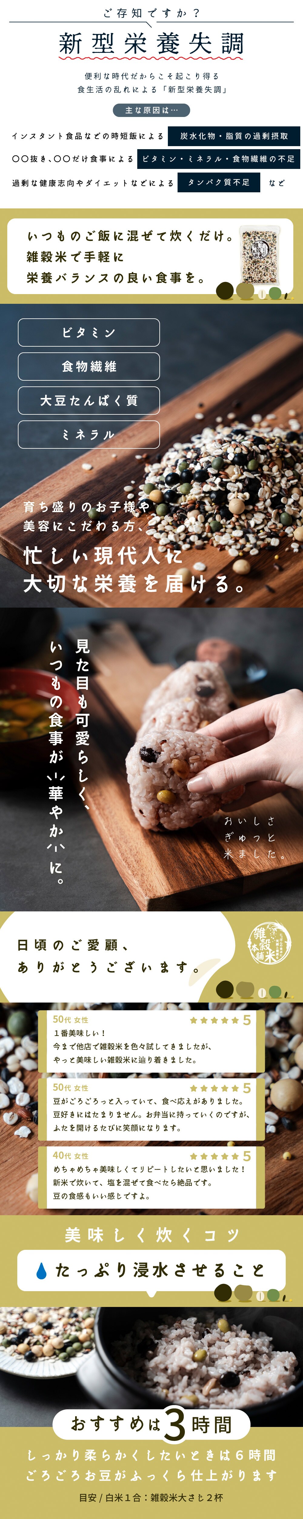 ・原材料/材質/素材:胚芽押麦、大豆、黒米、裸麦、黒大豆、小豆、赤米、青大豆、緑米、もちきび、はと麦、アマランサス、白胡麻、黒胡麻、金胡麻、(一部に大豆・ごまを含む)