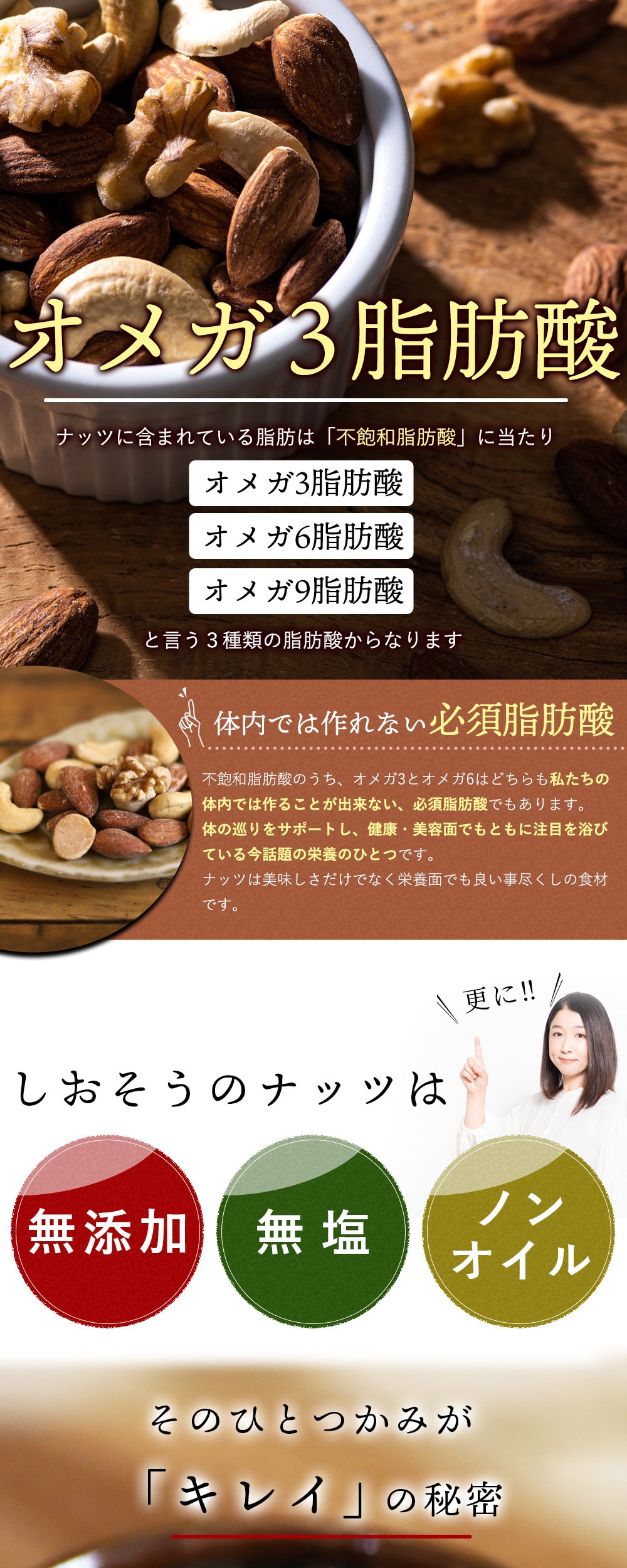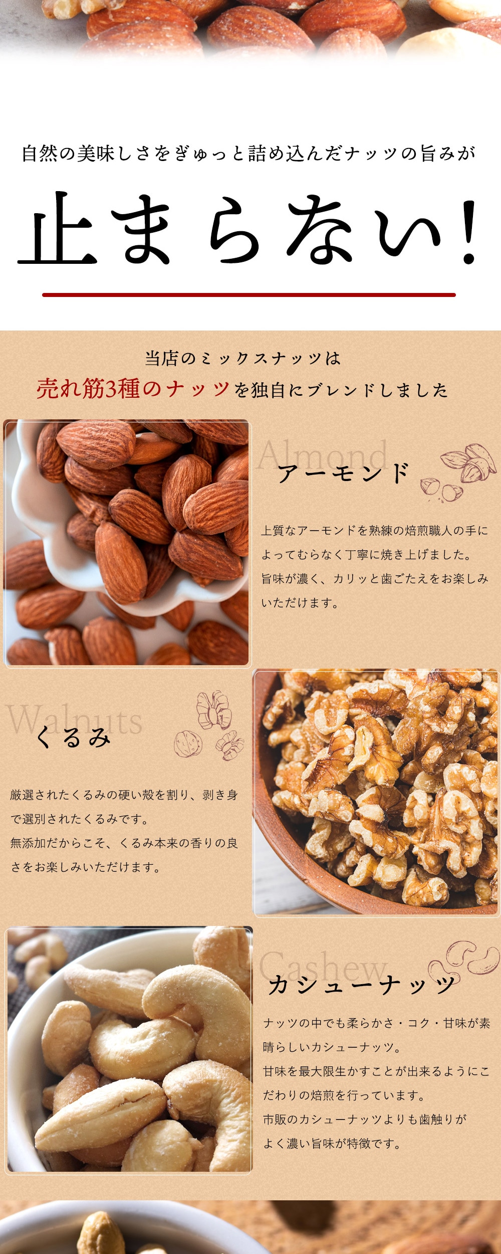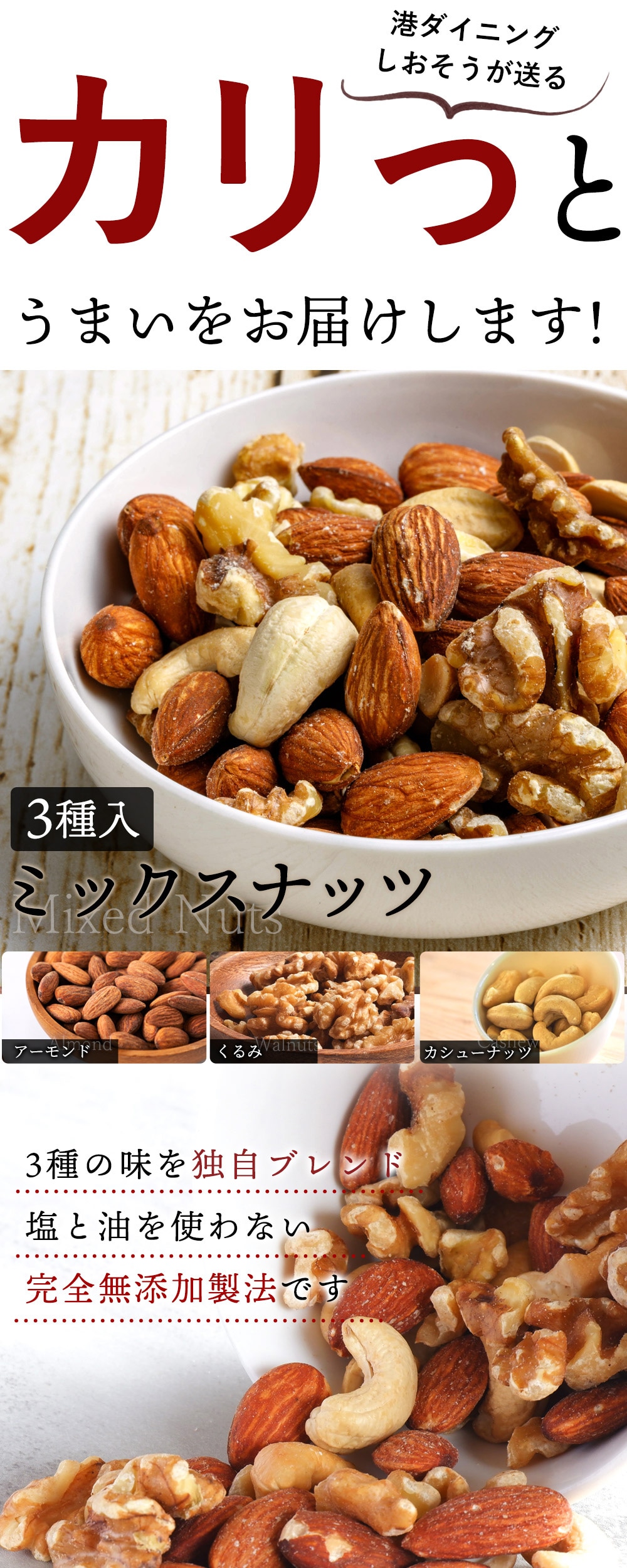 【3種の味を独自ブレンド!塩と油を使わない完全無添加製法です】当店のミックスナッツは、売れ筋3種のナッツを独自にブレンドしました。(アーモンド/くるみ/カシューナッツ)さらに!無添加・無塩・ノンオイル。自然の美味しさをぎゅっと詰め込んだナッツの旨みが止まらない!