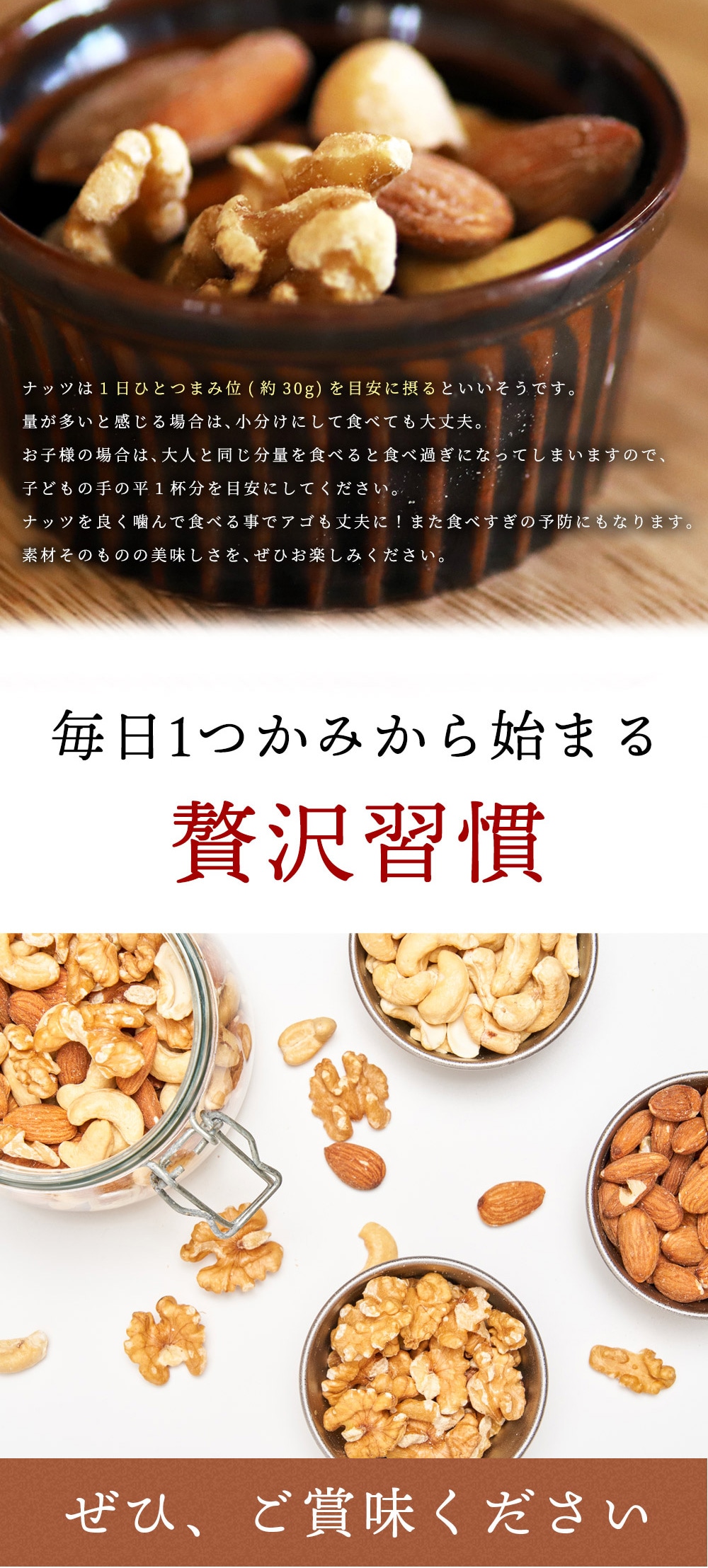 【そのひとつかみが「キレイ」の秘密】ナッツは1日ひとつまみ位(約30g)を目安に摂るといいそうです。量が多いと感じる場合は、小分けにして食べても大丈夫。お子様の場合は、大人と同じ分量を食べると食べ過ぎになってしまいますので、子どもの手の平1杯分を目安にしてください。ナッツを良く噛んで食べる事でアゴも丈夫に!また食べすぎの予防にもなります。素材そのものの美味しさを、ぜひお楽しみください。