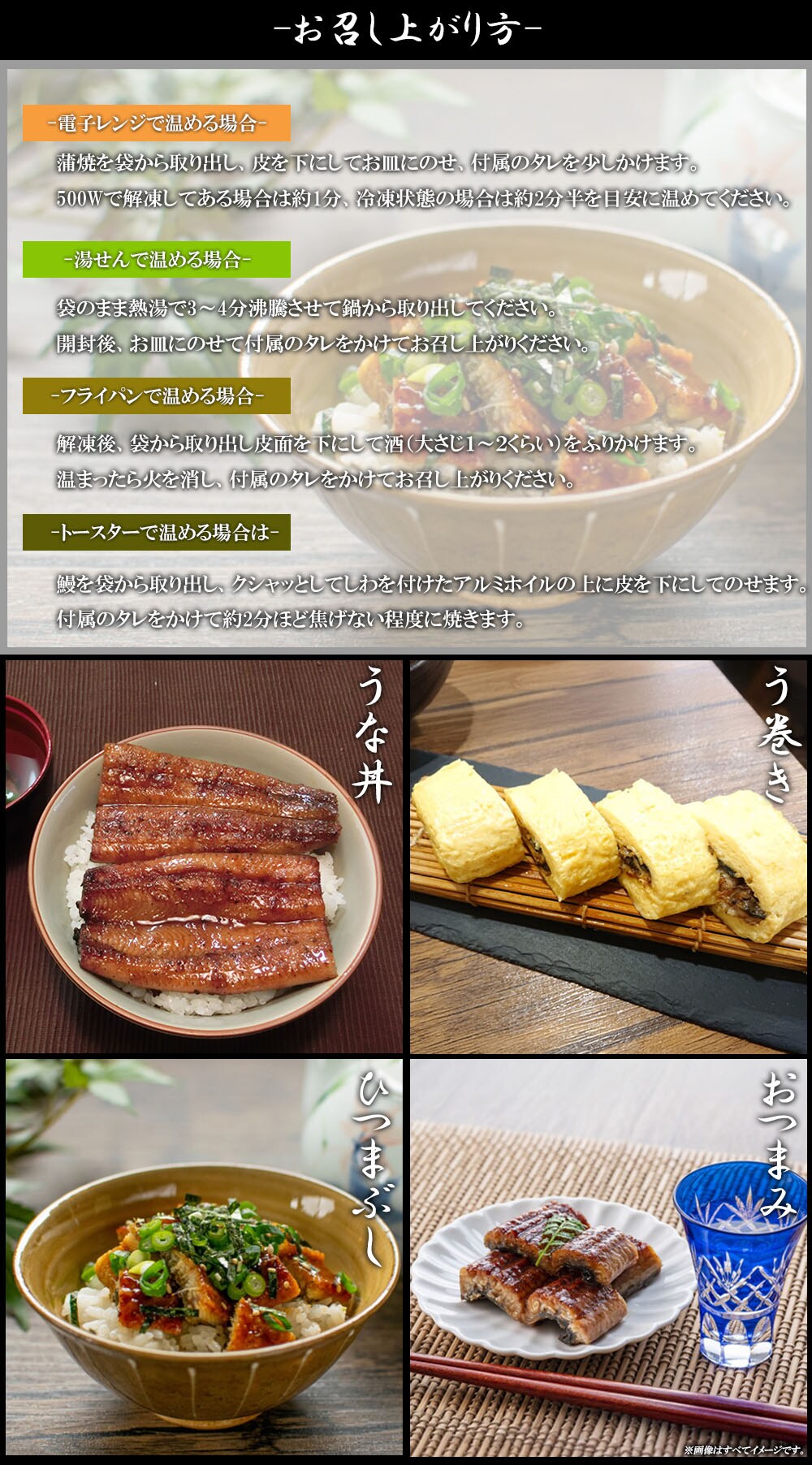 うなぎ(鹿児島県産)、しょうゆ(小麦、大豆を含む、国内製造)、糖類(砂糖、ぶどう糖果糖液糖)、みりん、酒、はちみつ、うなぎエキス