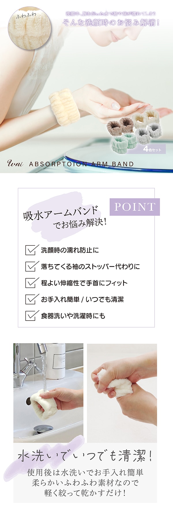 【4色セット】吸水アームバンド | 洗顔中、腕を伝った水で袖や床が濡れてしまう。そんな洗顔時のお悩み解消