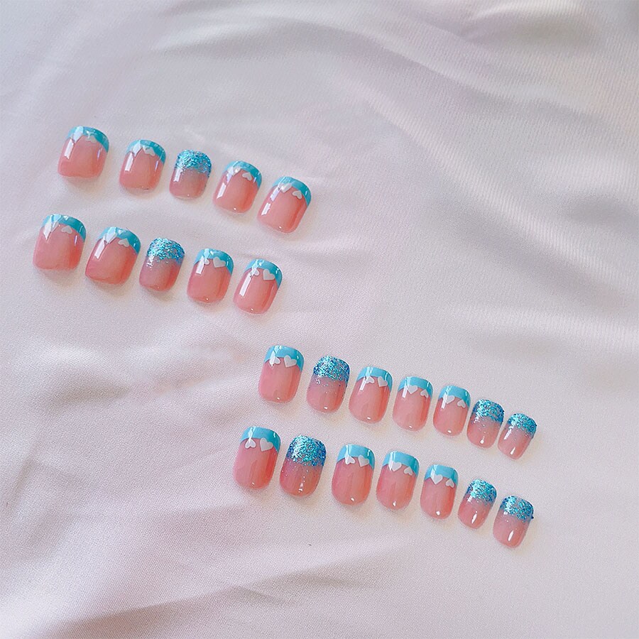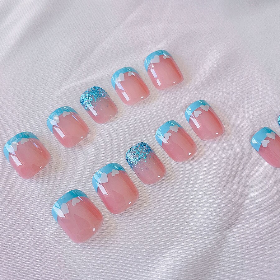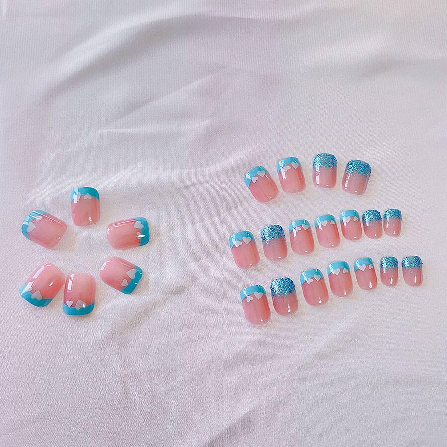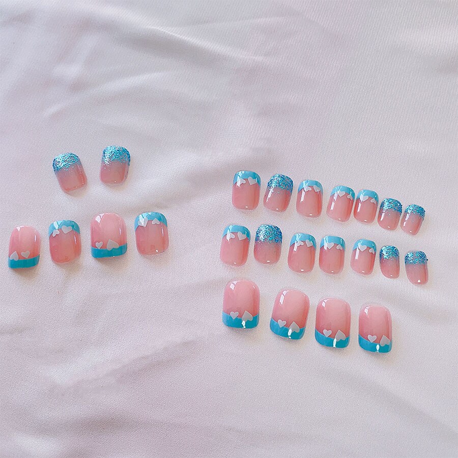 【24枚入】ネイルチップ フレンチネイル ピンク×ブルー系(タイプ:R481) | 色鮮やかなフレンチネイルにポイントのハートデザイン