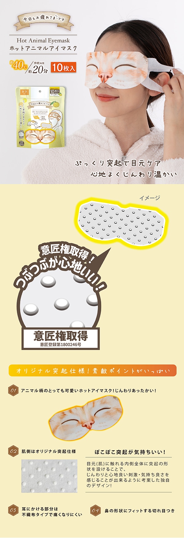 【ゆずの香り/10枚入/ネコ】お疲れさまですホットAnimalアイマスク | 肌側全体ぷっくり突起で心地よくじんわり温かい