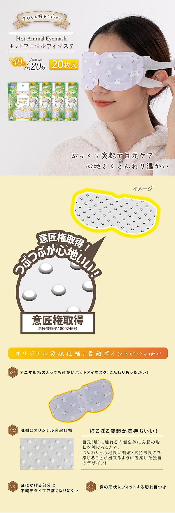 【森林浴の香り/5枚入×4袋/シマエナガ】お疲れさまですホットAnimalアイマスク | 肌側全体ぷっくり突起で心地よくじんわり温かい