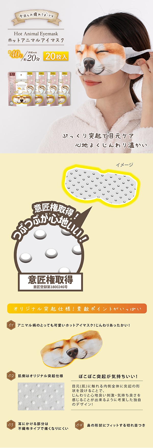 【無香料/5枚入×4袋/柴犬】お疲れさまですホットAnimalアイマスク | 肌側全体ぷっくり突起で心地よくじんわり温かい