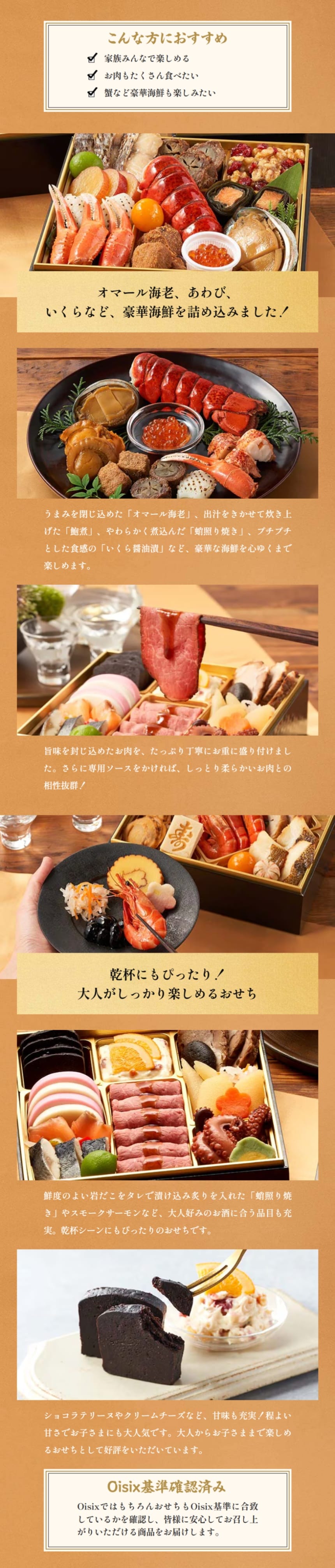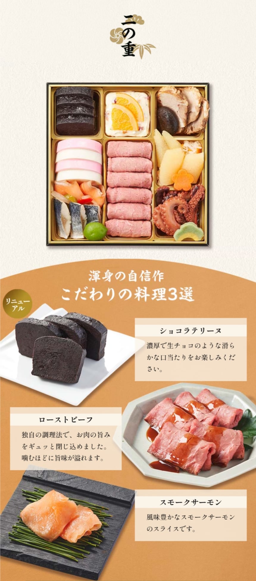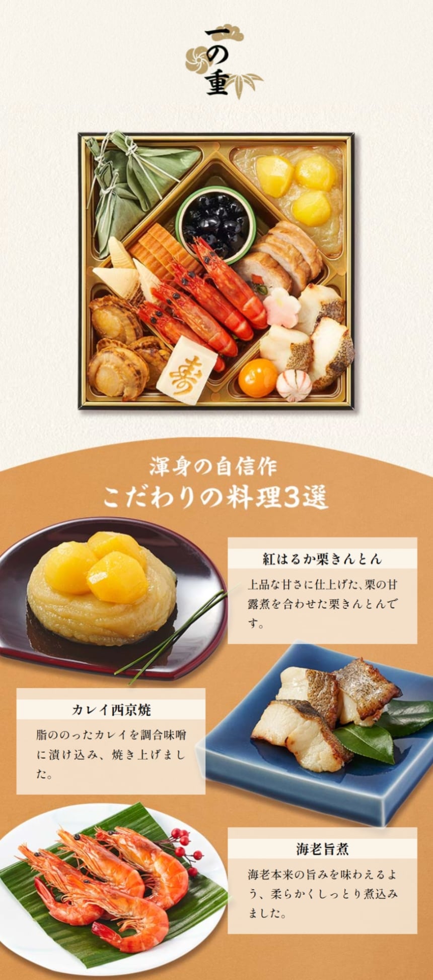 笹餅こしあん, ほたて煮, 寿高野, 伊達巻, 味付焼筍, 黒豆煮, 海老旨煮, 鶏肉三色巻, 梅麩甘露煮, 紅はるか栗きんとん, カレイ西京焼, 手まり麩, きんかんさわやか煮ショコラテリーヌ, 蒲鉾赤, 蒲鉾白, 彩野菜マリネ, スモークサーモン, にしん昆布〆, 若桃甘露煮, クリームチーズとフルーツピールオレンジ添え, ローストビーフ(ローストビーフソース付), チャーシュー, 椎茸煮, 紅白なます, 味付数の子, 梅人参煮, 蛸照り焼き, 松笠甘露煮真鯛の幽庵焼, 鳴門金時芋レモン煮, 若桃甘露煮, 松笠いか白焼き, わかめ, かに爪柚庵焼, 牛肉八幡巻, オマール海老, 魚卵甘露煮, きんかんさわやか煮, いくら醤油漬, 紅鮭昆布巻, 鮑煮, クランベリークルミ