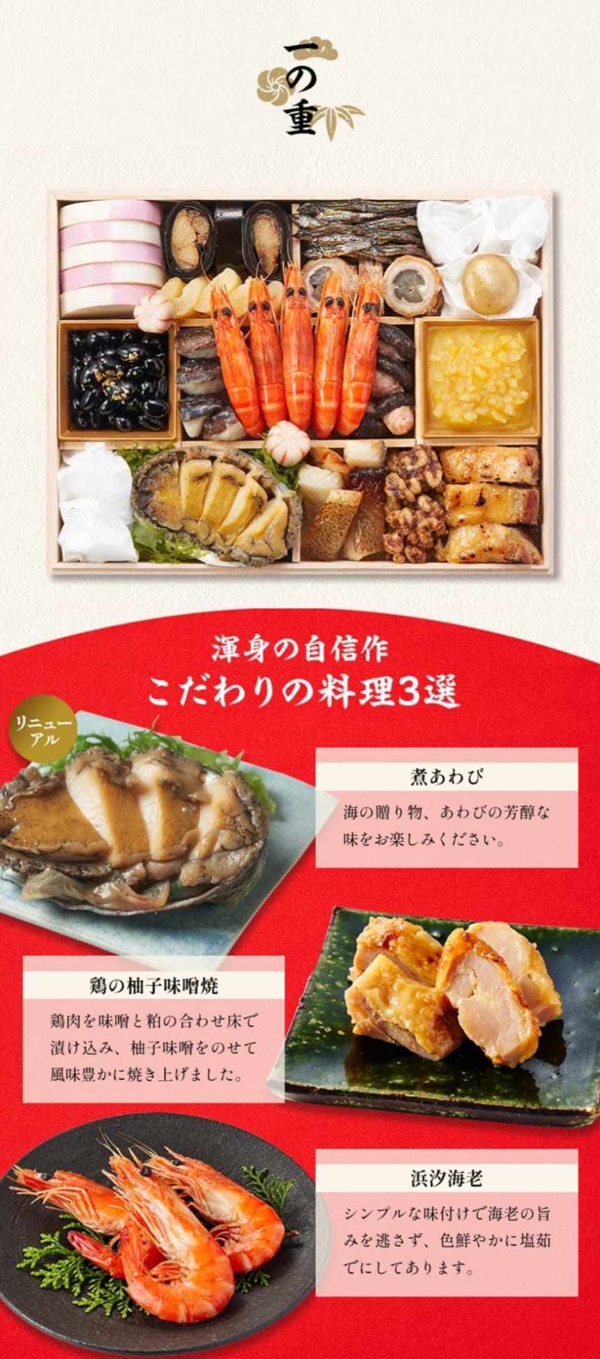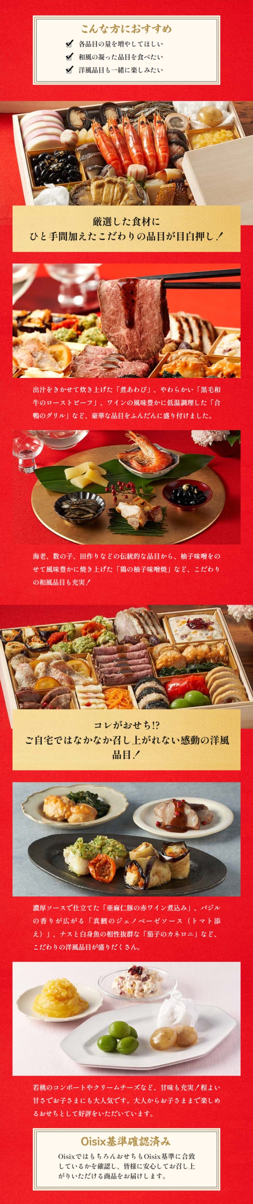 市松かまぼこ, 練昆布巻, 手まり麩, 数の子美味漬, 田作り, 琥珀ふくさ包み, 豚八幡巻, 金箔黒豆, 裏白しいたけ, 浜汐海老, 海老しいたけ, 栗きんとん(刻み栗), 煮あわび, カラスガレイ西京焼, かつをくるみ, 鶏の柚子味噌焼茄子のカネロニ, 真鱈のジェノベーゼソース(トマト添え), 合鴨のグリル ブラウンソース添え, ミックスビーンズのソテー, クリームチーズ クランベリーのせ, 赤魚のムニエル レモンバタークリーム, 黒毛和牛のローストビーフ(ソース付), 帆立のアメリケーヌソース, ほうれん草のバターソテー, 亜麻仁豚の赤ワイン煮込み, 野菜とレンズ豆の味噌チーズ, キャロットラペ, チキンサラメ, パプリカのハーブマリネ, 若桃のコンポート レモン風味, 鶏と彩り野菜の包み焼
