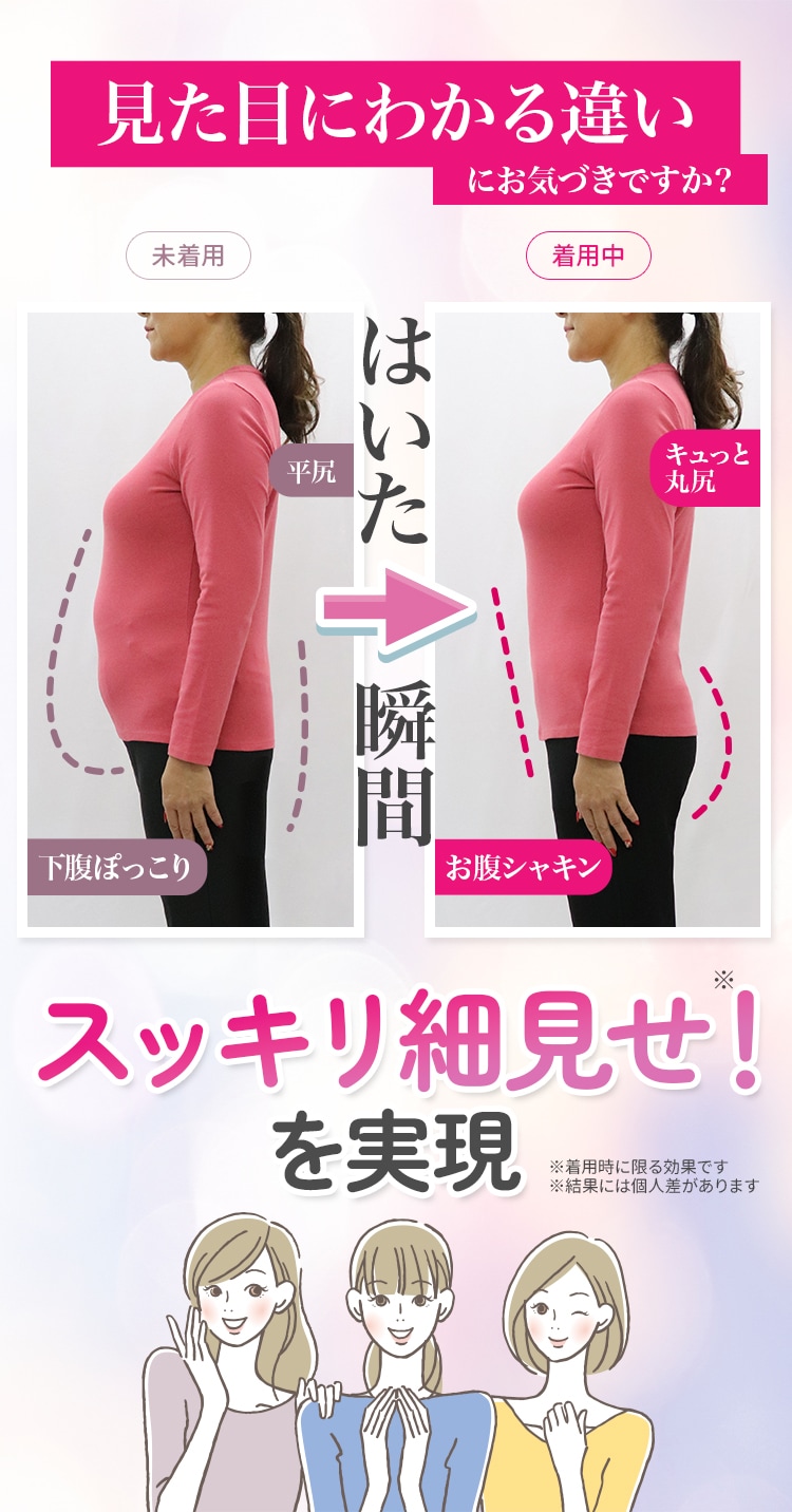 視覚効果で足が細く長く見えるパンツの中にパワーメッシュの骨盤ベルトを内蔵。