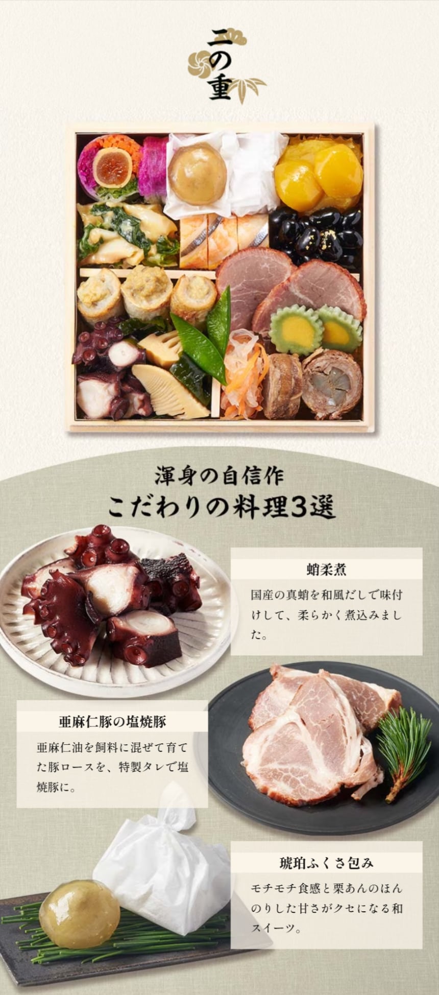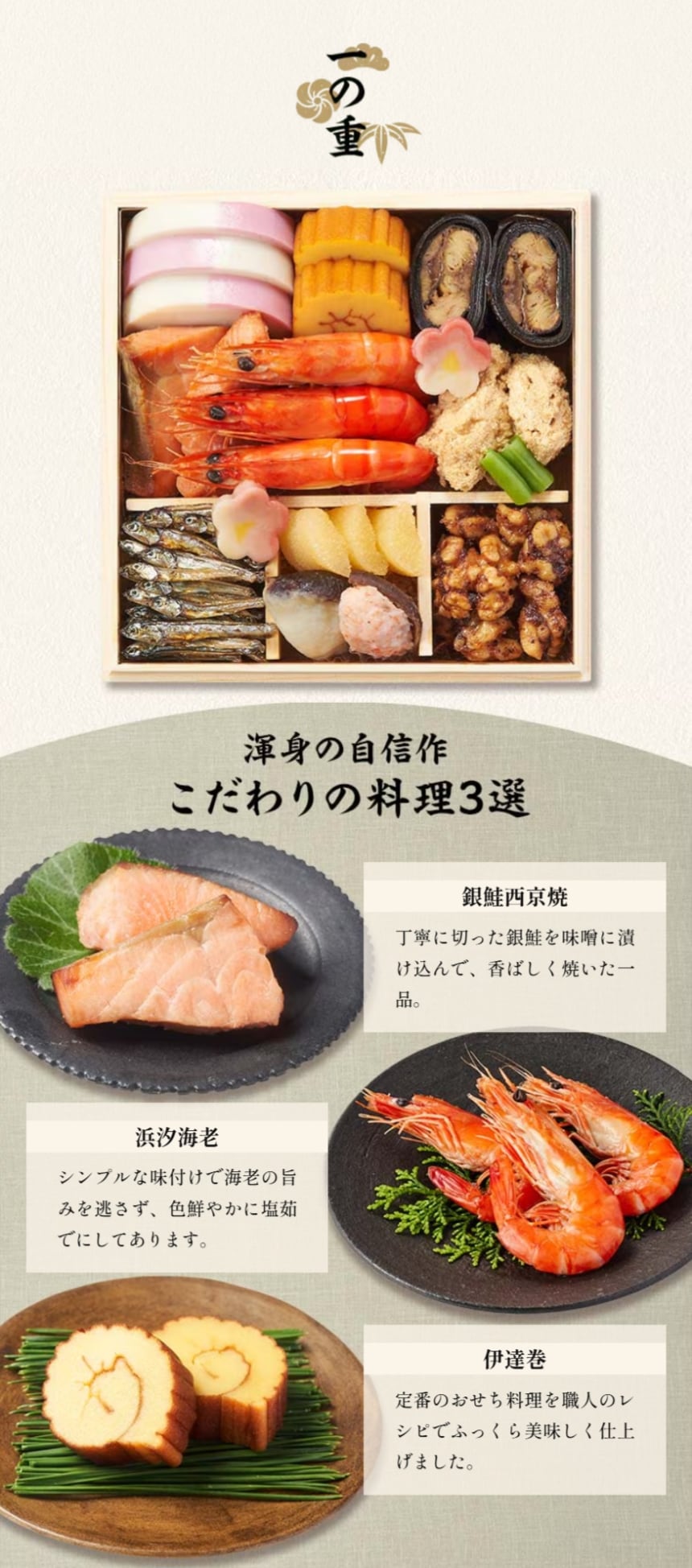 市松かまぼこ, 伊達巻, 練昆布巻, 紅白梅麩, 銀鮭西京焼, 浜汐海老, 鰤の子吉野煮, いんげん, 田作り, 数の子美味漬, 裏白しいたけ, 海老しいたけ, かつをくるみ彩りきぬた巻, 琥珀ふくさ包み, 栗きんとん(甘露栗2個), つぶ貝と小松菜の酢味噌和え, きびなご手綱, 絹さや, 金箔黒豆, のど黒の包み焼, 柔煮, 竹の子土佐煮, わかめ, 亜麻仁豚の塩焼豚, 竹麩, 紅白なます, 牛八幡巻