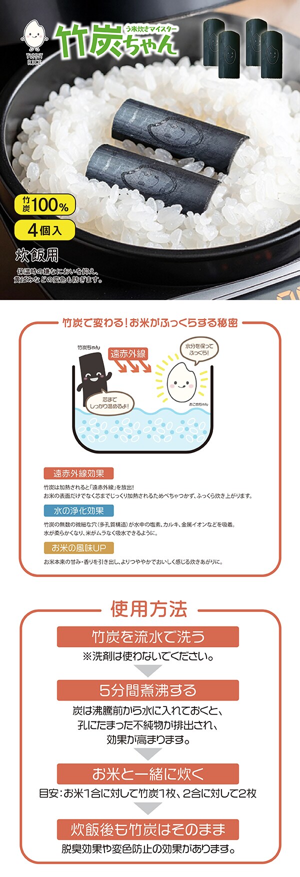 【4個セット】う米炊き(うまだき)マイスター竹炭ちゃん | 炊飯器に入れて一緒に炊くだけ!竹炭でお米がふっくら。