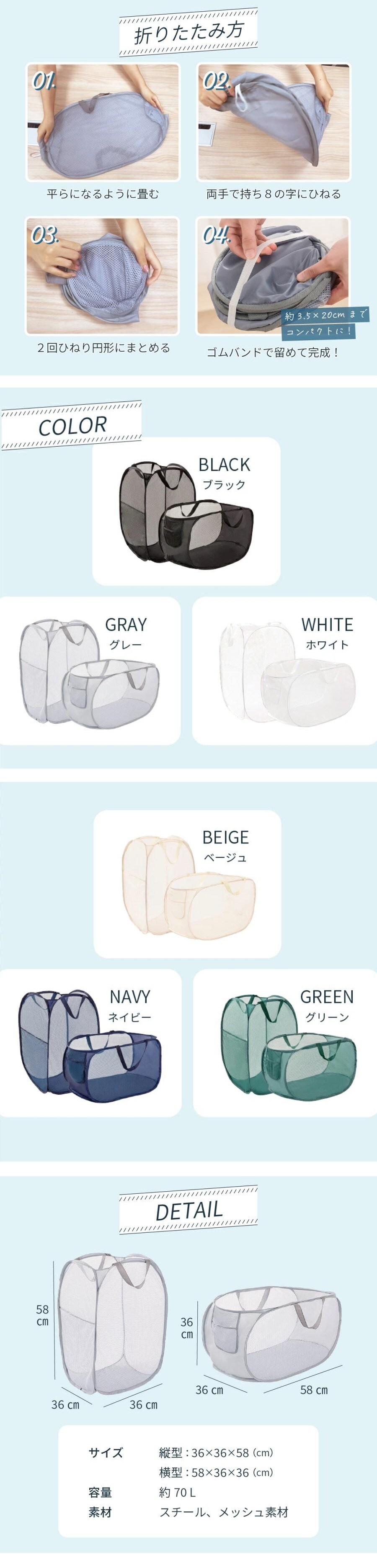- 【グリーン・縦型】折りたたみメッシュランドリーバスケット