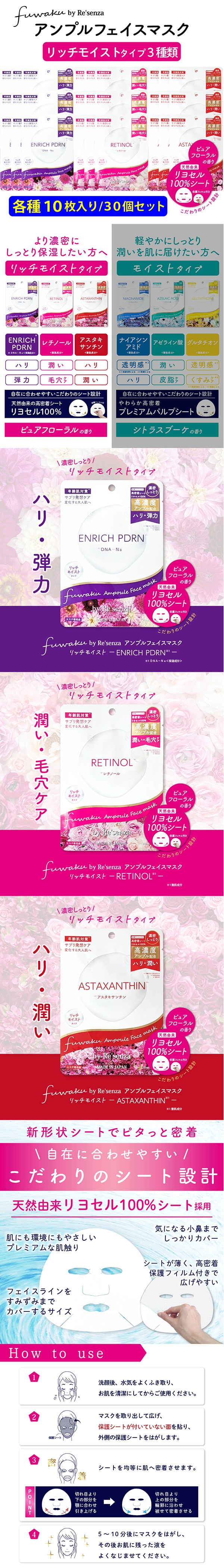 【リッチモイスト30個セット】fuwaku byRe'senza アンプルフェイスマスク 各10枚入 | 変化する大人肌へサプリ発想ケア 高濃度アンプル配合贅沢シートマスク