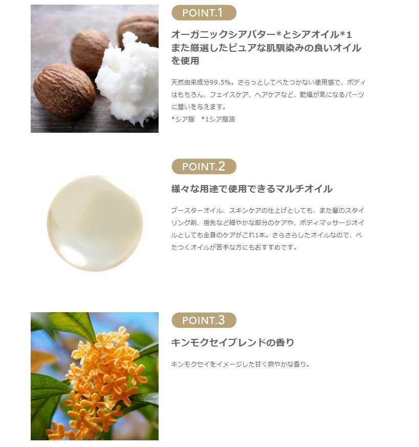 ブースターオイル、スキンケアの仕上げとしても、また髪のスタイリング剤、指先など細やかな部分のケアや、ボディマッサージオイルとしても全身のケアがこれ1本。さらさらしたオイルなので、べたつくオイルが苦手な方にもおすすめです。