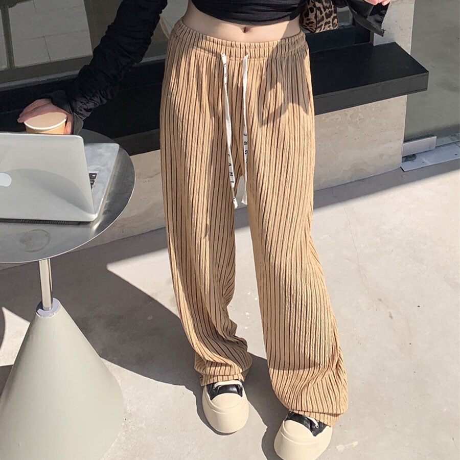 【キャメル】 ストライプワイドパンツ | サラサラとして柔らかいストレートワイドパンツ