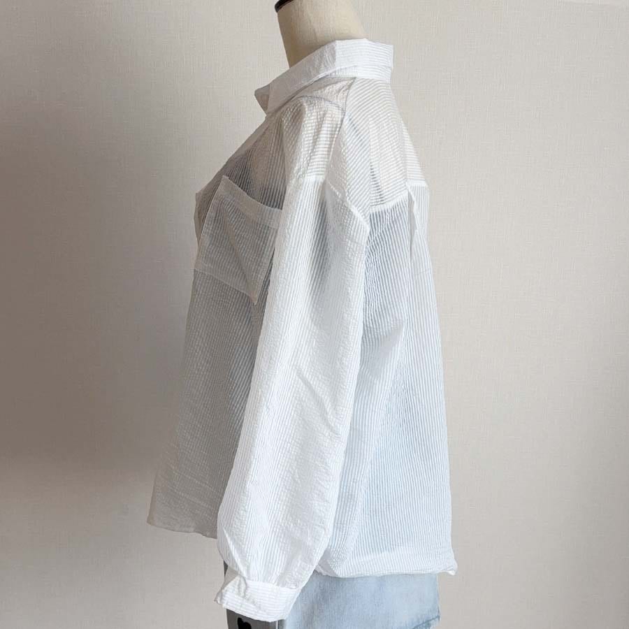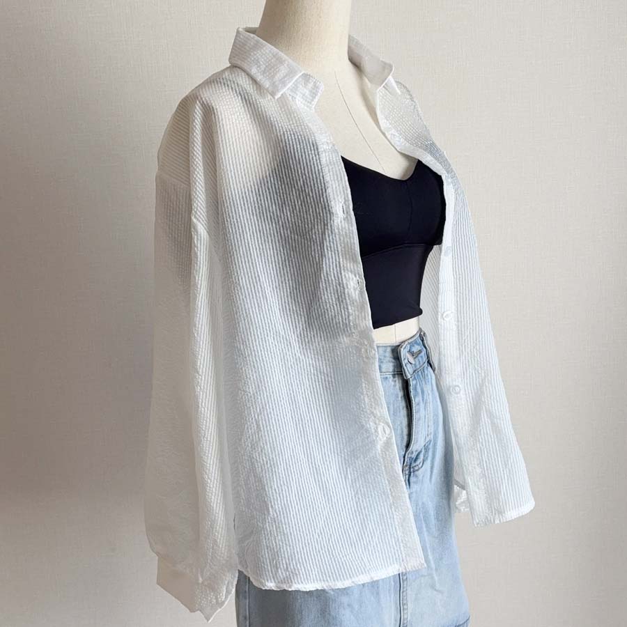 【ホワイト】シャツカーディガン 透け感ボーダー | 夏の季節にピッタリな透け感のあるシャツカーディガン